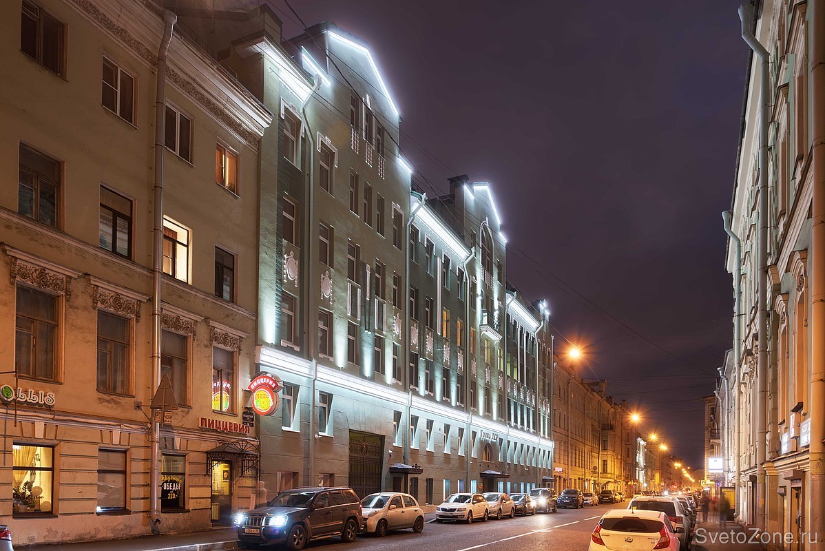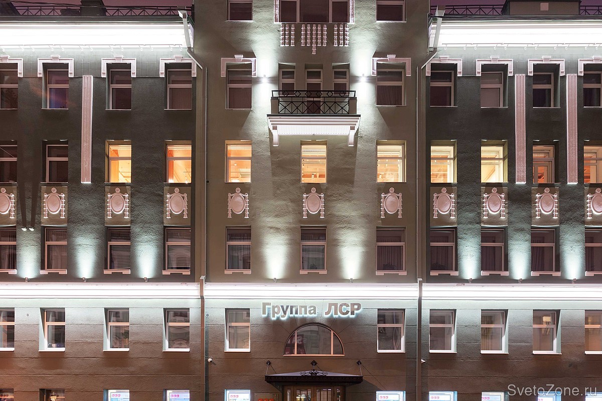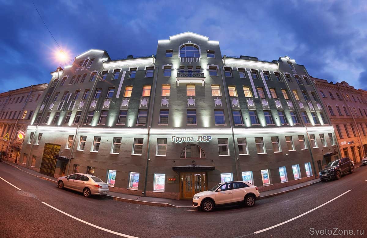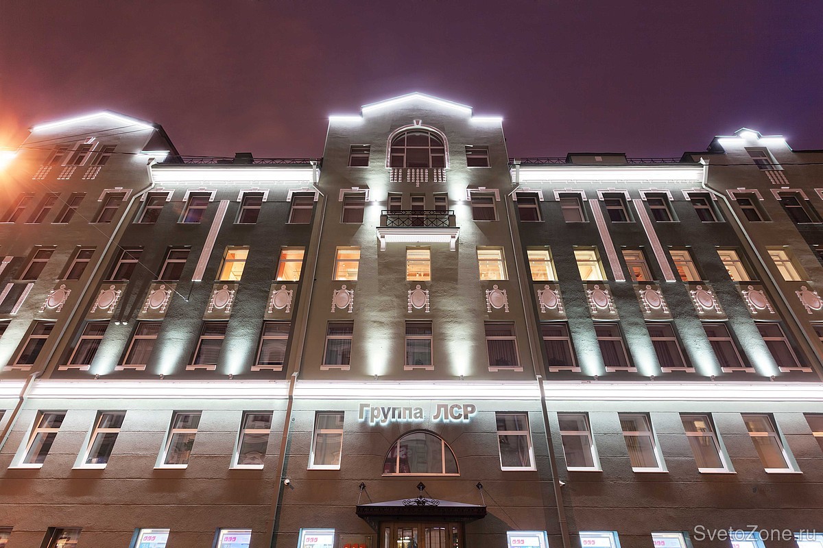 Два первых этажа выделены с помощью функционального контурного освещения. Для данного приёма использованы диммируемые светильники серии IntiSLIM с овальной оптикой, которые смотрятся на фасаде компактно и легко.