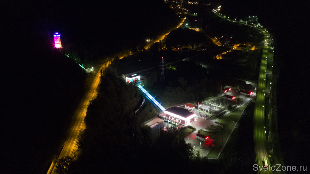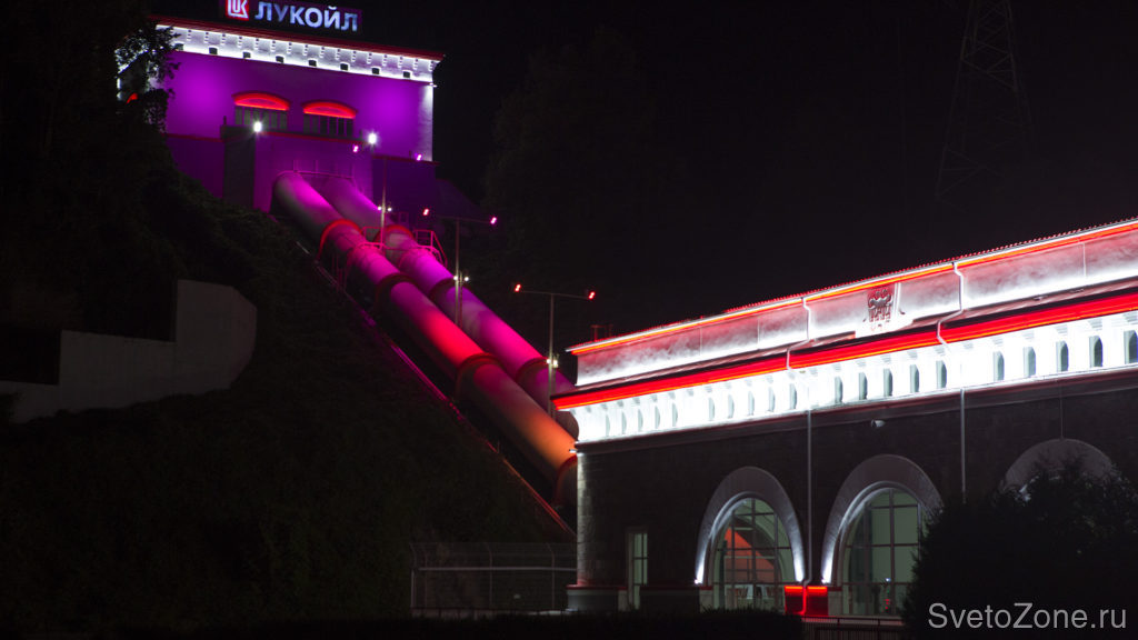 В качестве идеи архитектурного освещения комплекса зданий Краснополянская ГЭС разработана концепция с применением цветов Компании Лукойл. В основу заложены симбиоз динамического и статического освещения.