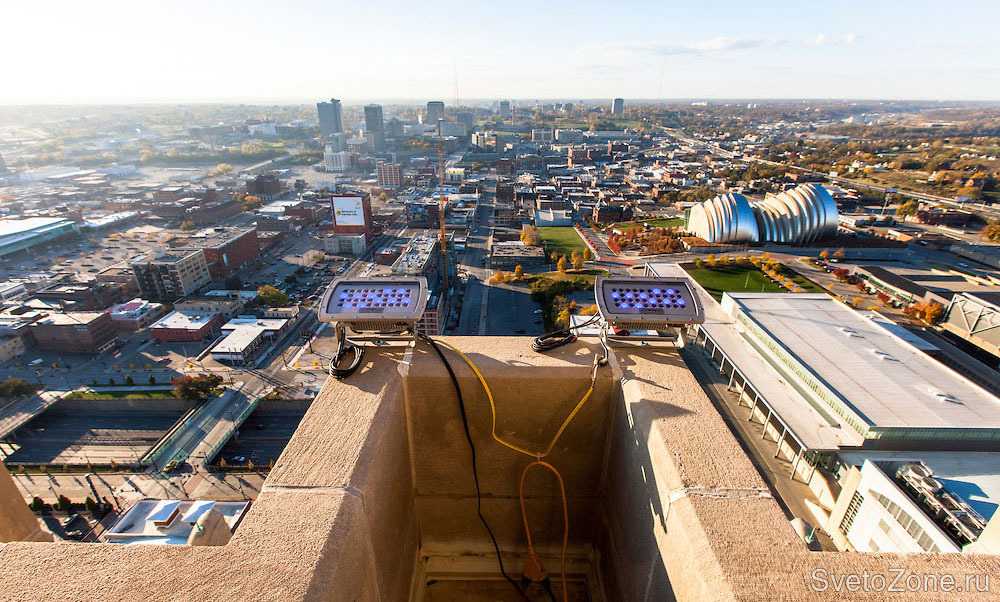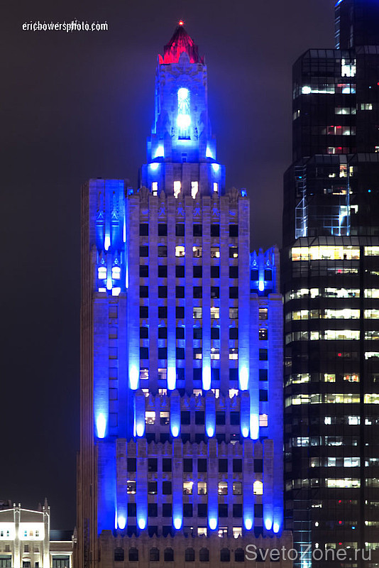 Первоначальная установка предполагала возможность освещения фасадов исключительно белым цветом, верхушка здания могла менять цвет от синего до красного и от зеленого до оранжевого. Старые добрые белые спотлайты, часть из которых отреставрирована и приборы используются в качестве элементов декора в ресторане на самой верхушке небоскреба, заменены на современные светодиодные прожекторы. 54 светодиодных прибора с оптикой спот размещены по периметру здания, 8 прожекторов установлены на смотровой площадке и еще восемь в самой башне. Восемь прожекторов смонтированы внутри стеклянного шпиля в самом верху здания и предназначены для имитации эффекта пламени.