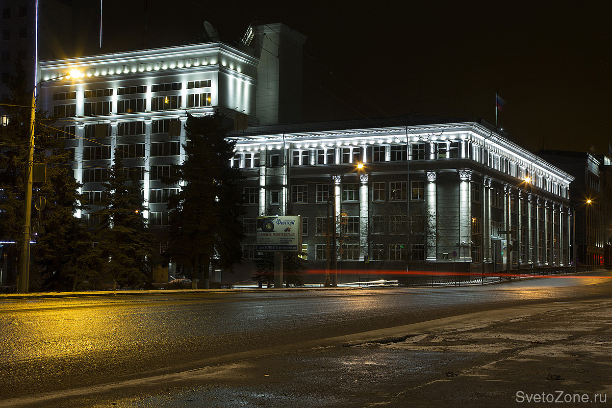 Расположение фасада банка напротив зданий Законодательного собрания, Министерств экологии и имущества и природных ресурсов, Арбитражного суда и Контрольно-счетная Палаты Челябинской Области вносили свои требования к освещению по соблюдению статусности здания в ночное время суток.