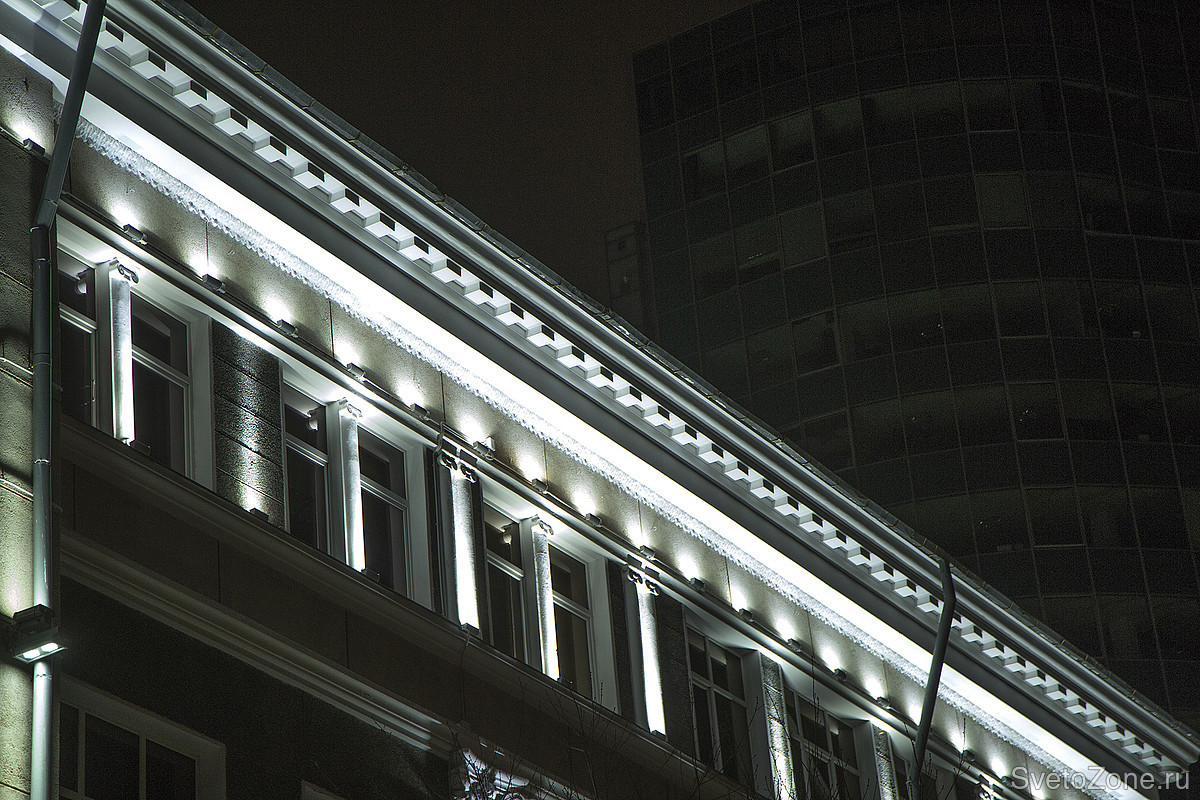 Для монтажа системы освещения разработан электропроект с указаниями специфики монтажа изделий. В связи с особенностями здания монтаж выполнен с применением Спецтехники, открытой проводкой в пластиковых трубах по фасаду здания.