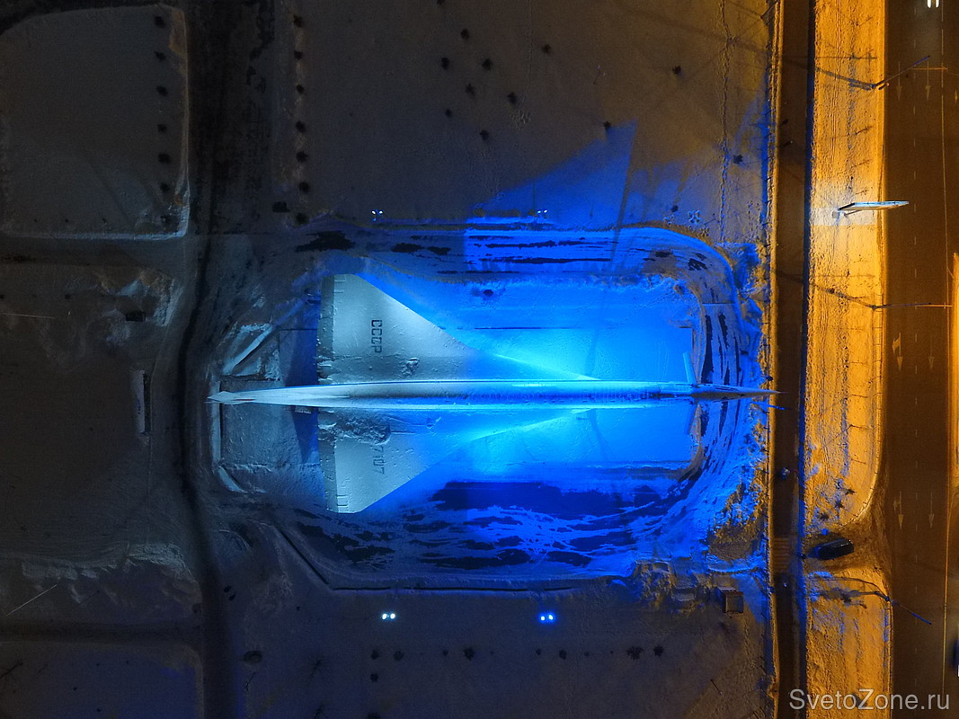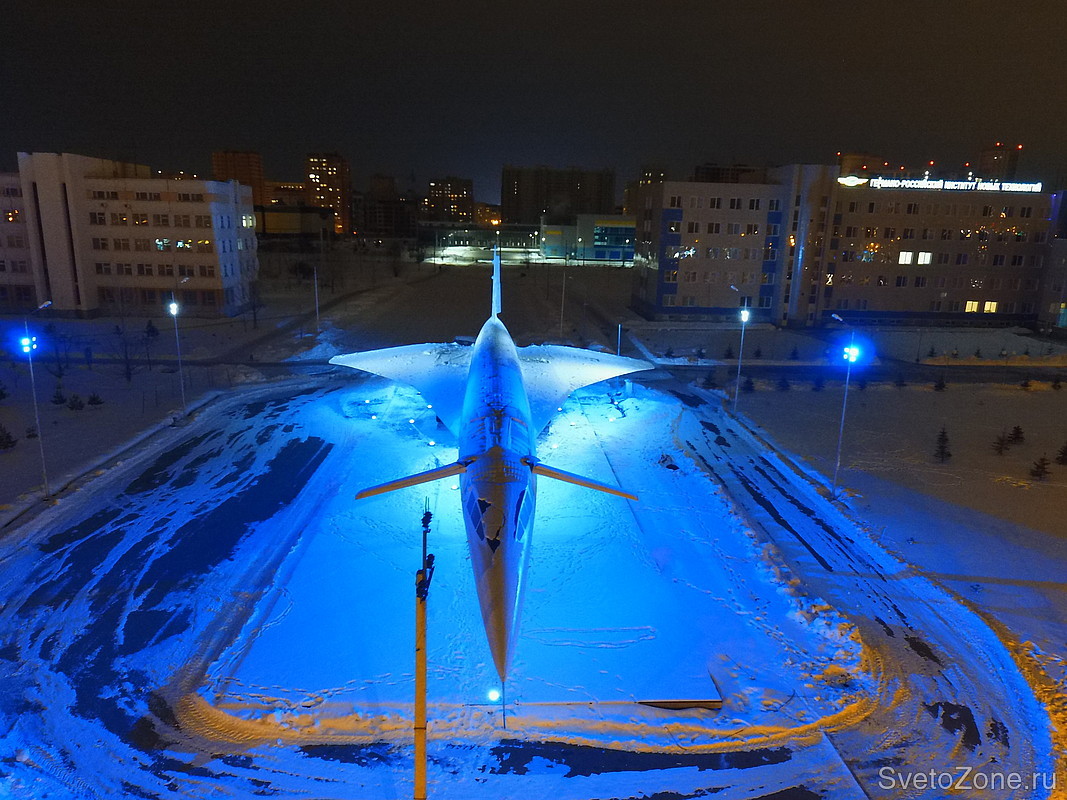 Отреставрированный снаружи самолет предстал перед жителями и гостями города в лучах прожекторов производства компании IntiLED.