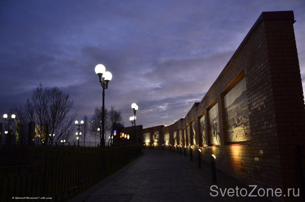 В центральной части комплекса, который занимает площадь более пяти тысяч квадратных метров, располагается смотровая площадка круглой формы. В центре площадки установлен монумент из трех колонн, подсвеченных вмонтированными в плитку грунтовыми светильниками XLD-ALGA со специальной эллиптической оптикой и возможностью регулировки направления светового пучка (направление можно фиксировать в углах 20, 30 и 40 градусов). Возле монумента установлена кирпичная стена, на которой размещены награды Мурманска и стенды с архивными фотоматериалами. В темное время суток они подсвечены прожекторами XLD-FL12 с поворотными механизмами, позволяющими настраивать световую экспозицию.