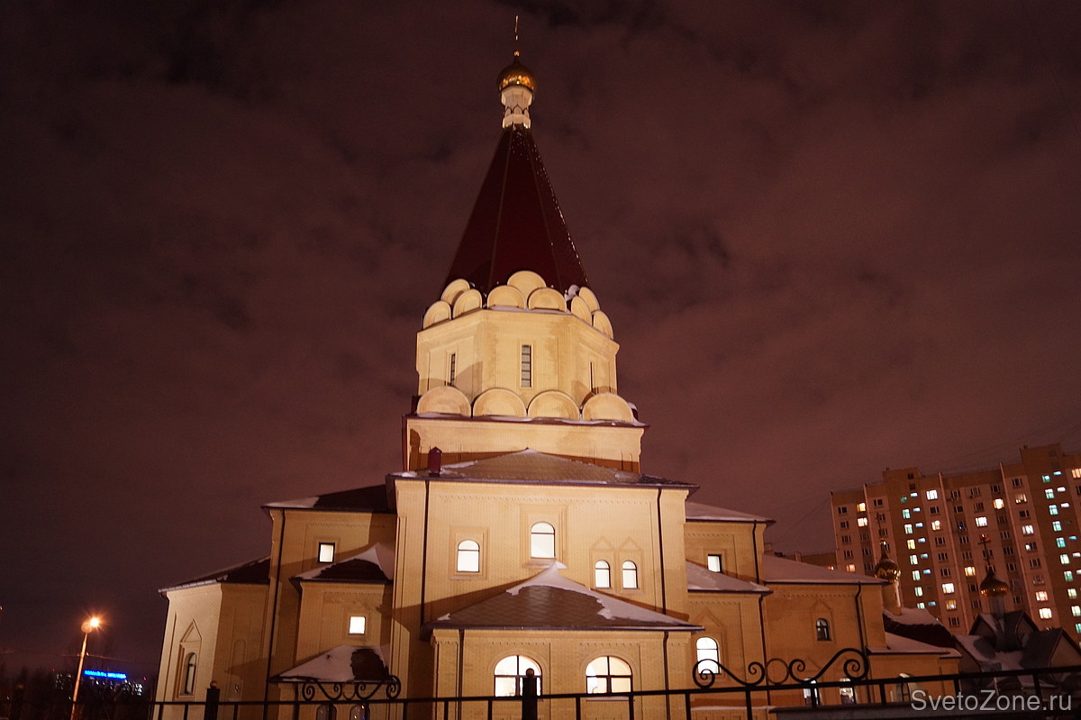 Заказчик поставил задачу реализовать общее заливающее освещение основного здания храма с использованием минимального количества световых приборов. Для решения этой задачи было использовано апробированное во многих проектах решение на светодиодных прожекторах XLight серии "XLD-FL36". Для решения этой задачи оказалось достаточно всего четырех прожекторов с высокой световой отдачей и индексом цветопередачи. Естественный белый цвет свечения в сочетании со специально подобранной оптической системой помогли выделить храм в ночном облике молодого микрорайона столицы, который можно назвать его визитной карточкой. Установленная мощность осветительной установки на основе светодиодных светильников XLD-FL36 составила всего 0,32 кВт.