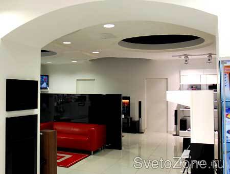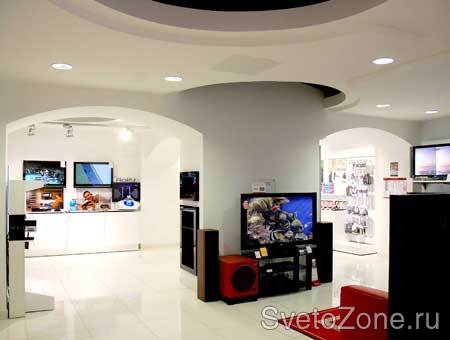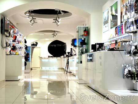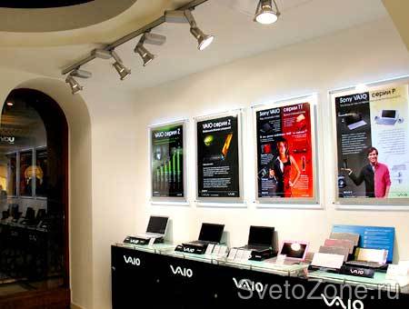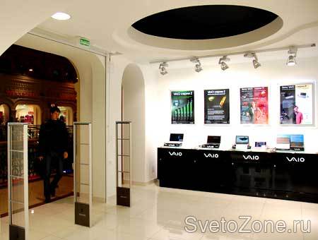 При создании проекта нам была поставлена задача создания освещения по зонам. Акцентная подсветка ноутбуков VAIO, фотоаппаратов Cyber-shot, цифровой техники Handycam выполнена с помощью металлогалогенных прожекторов Premium Axial (Lival). При освещении зала с ЖК-телевизорами BRAVIO было важным отсутствие бликов на экранах, именно поэтому здесь было реализовано только общее освещение с помощью встраиваемых светильников HONY E (Lival).