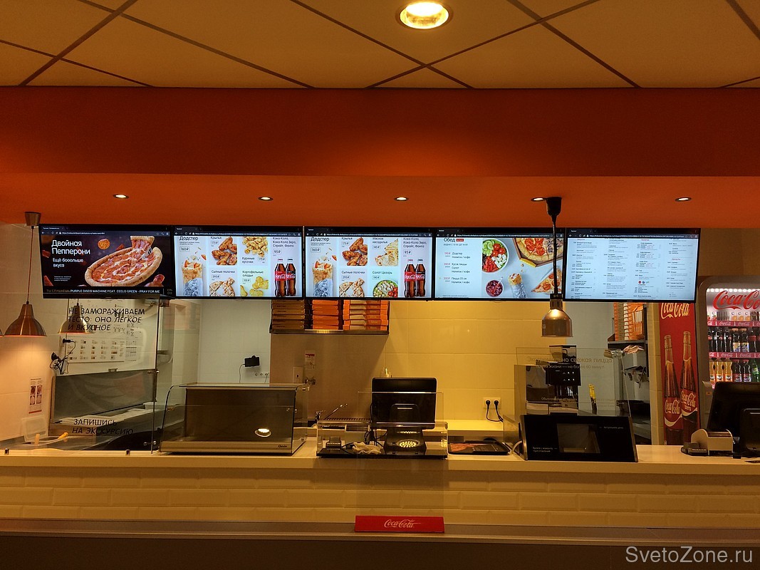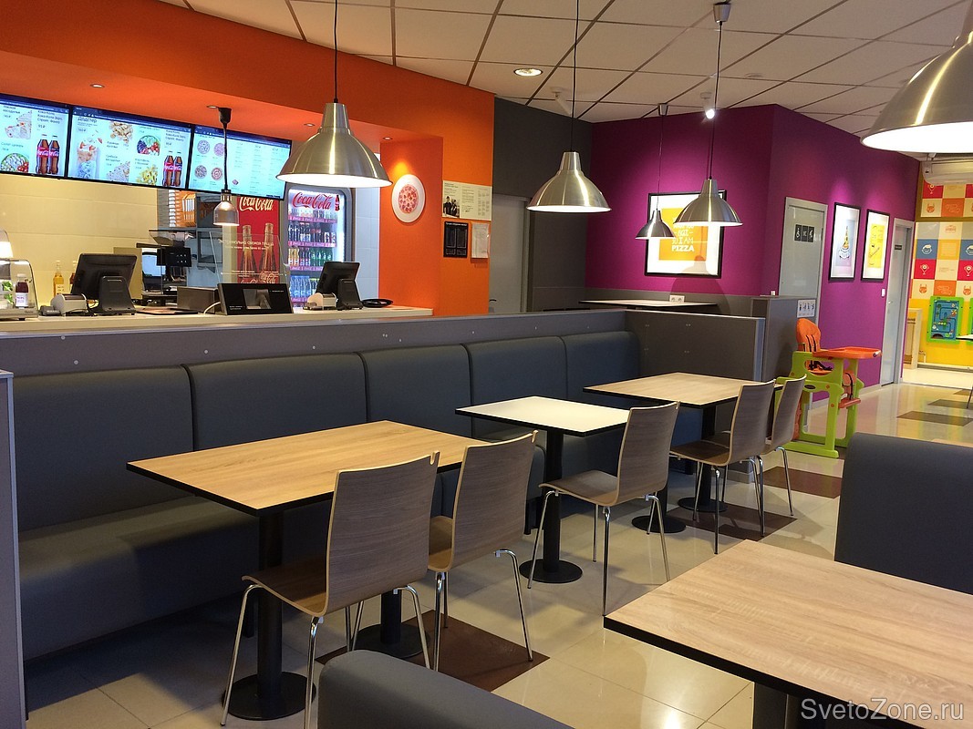 Светильники Acara M — это светильник с «накладным» вариантом монтажа. Его очень удобно применять, когда есть необходимость локальной подсветки и нет возможности (технической или дизайнерской) установить шинопровод. В данной пиццерии светильники использованы для дополнительного акцентного освещения картин, постеров, плакатов в помещении пиццерии. Как всегда, компания ArmatorLed предлагает данные светильники в нескольких вариантах исполнения. Во-первых, мы можем установить несколько видов оптики (10, 24 и 38 градусов) для более точного подбора угла света под нужды конкретного помещения. Во-вторых — мы предлагаем 2 цвета корпусов (черный и белый). В-третьих мы готовы доработать данный светильник и сделать его диммируемым по протоколу TRIAC или DALI на выбор клиента. |