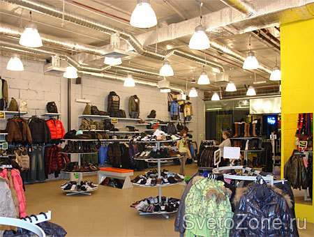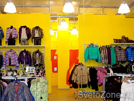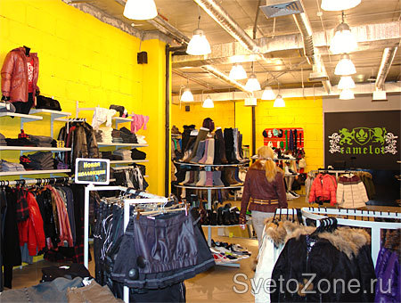 Все торговое пространство магазина визуально поделено на три зоны: мужская одежда, женская одежда и обувь. Полностью повторяет трехступенчатую выкладку и система освещения, выполненная с использованием подвесных светильников MENK. Металлогалогенные лампы CMH-T (GE), которые были применены в проекте освещения Camelot, создают не только яркий и равномерный свет, но и экономят электроэнергию.