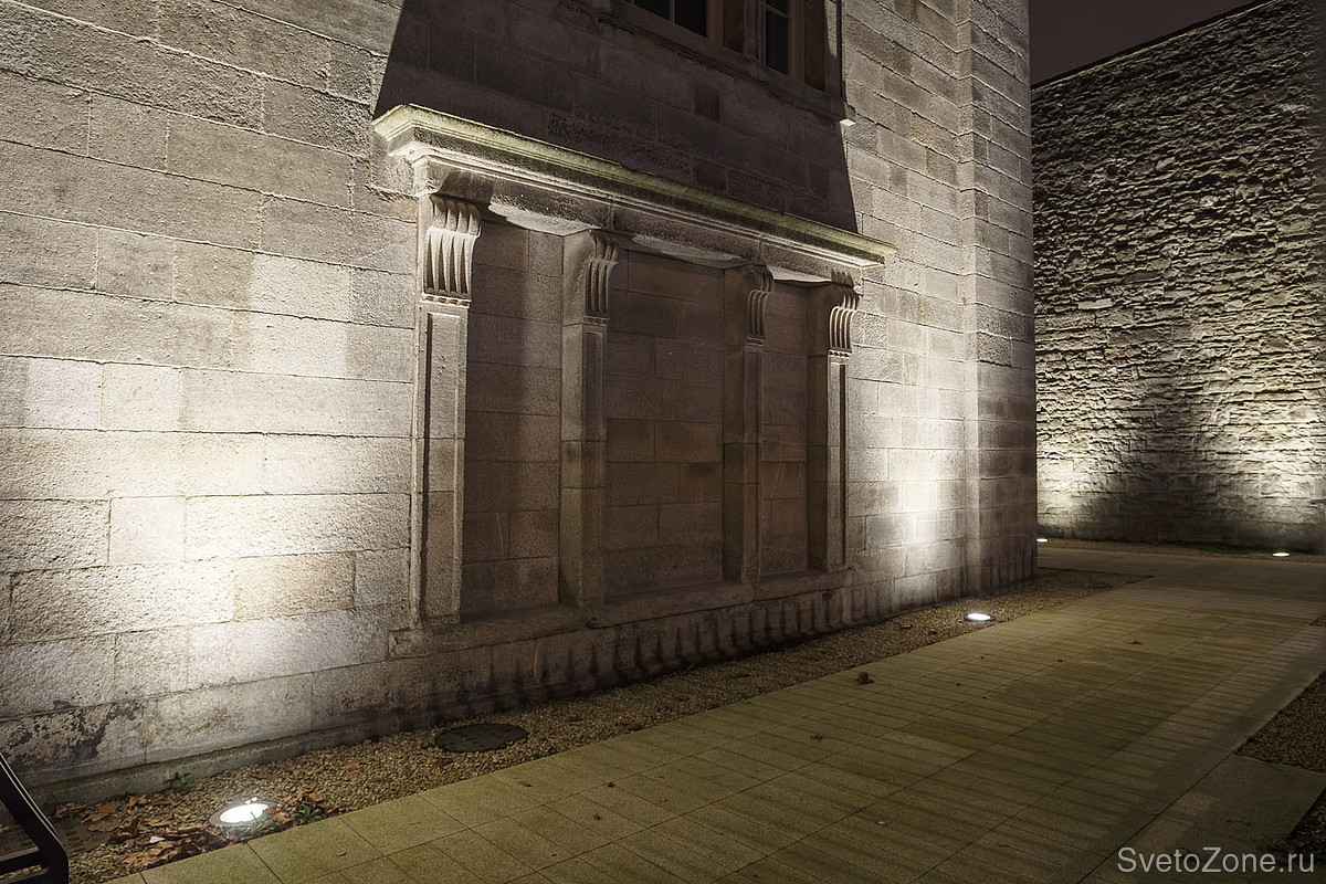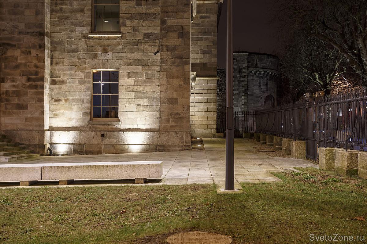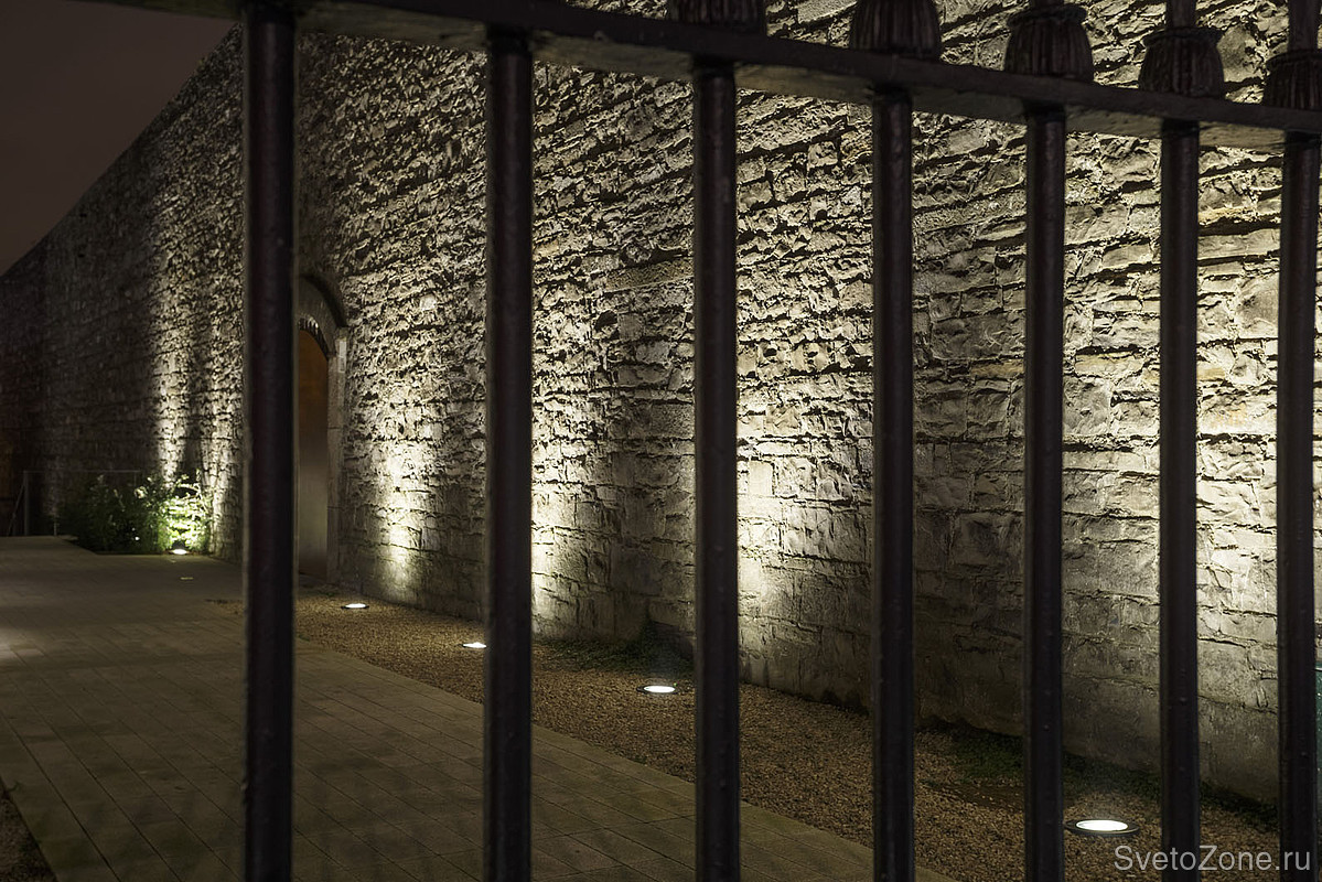 В рамках реконструкции, внешний периметр комплекса и прилегающая территория наполнены теплым белым светом встраиваемых прожекторов GRIVEN. Светодиодные приборы DUNE MK2 установлены в мощение согласно разработанной схеме и формируют световые пучки белого света, за счет теней создавая на стенах старинной тюрьмы эффект недосказанности и трагизма прошедшей героической эпохи.