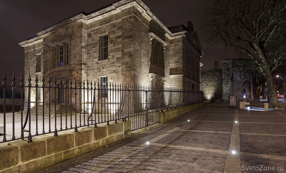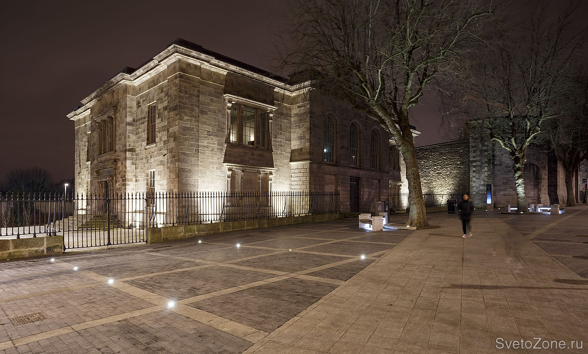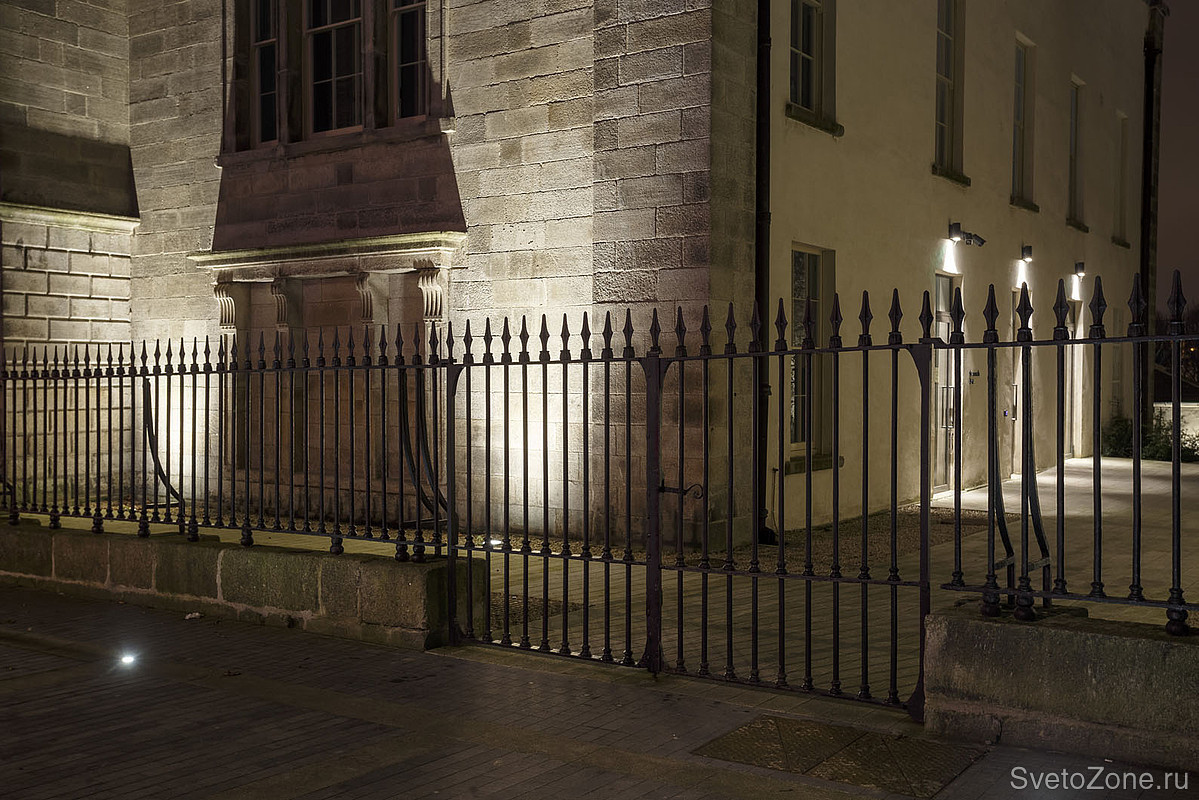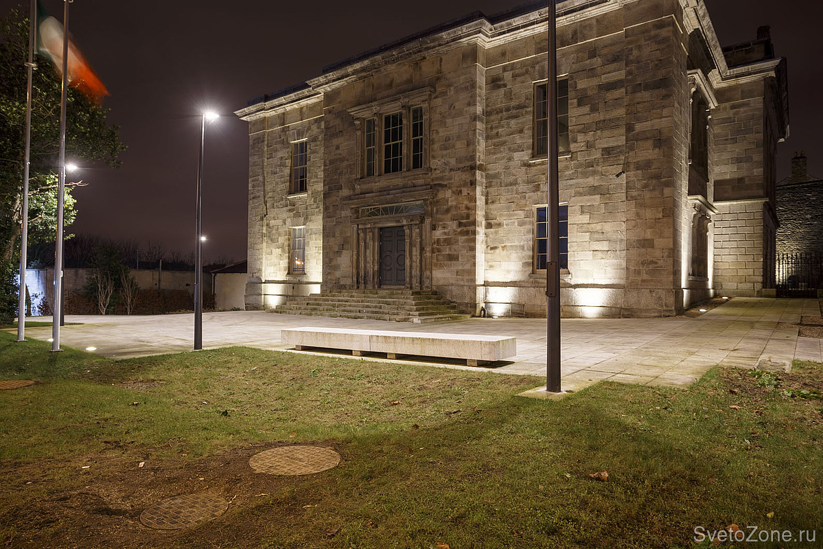 В рамках реконструкции, внешний периметр комплекса и прилегающая территория наполнены теплым белым светом встраиваемых прожекторов GRIVEN. Светодиодные приборы DUNE MK2 установлены в мощение согласно разработанной схеме и формируют световые пучки белого света, за счет теней создавая на стенах старинной тюрьмы эффект недосказанности и трагизма прошедшей героической эпохи.