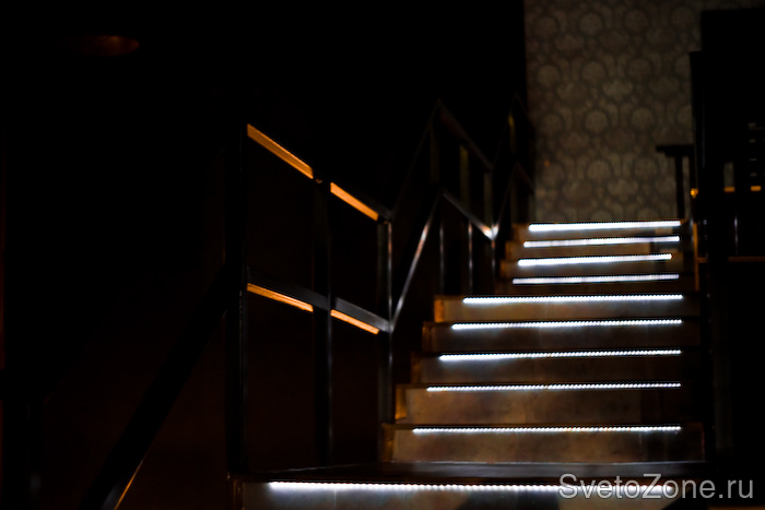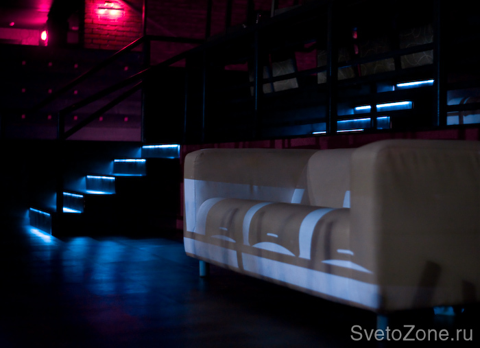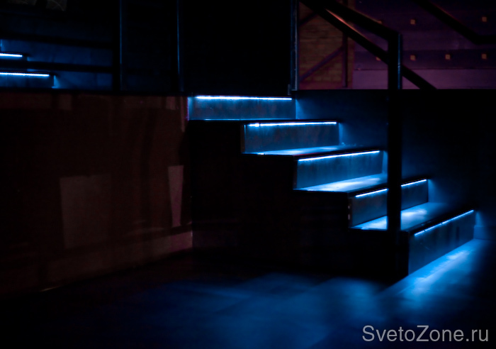 Цель подсветки - обозначить контуры ступеней, так как во время концертов свет в зале приглушен. |