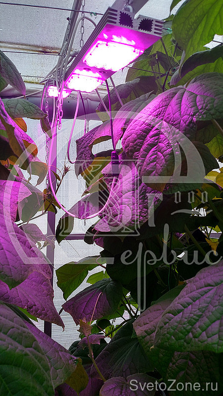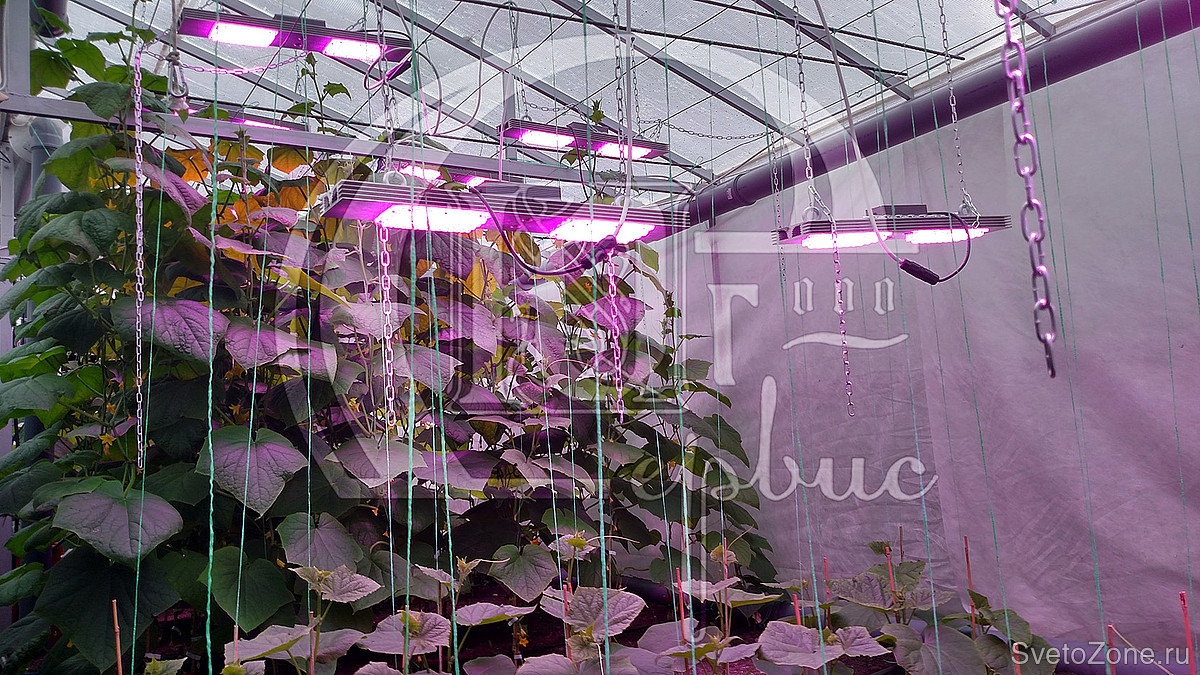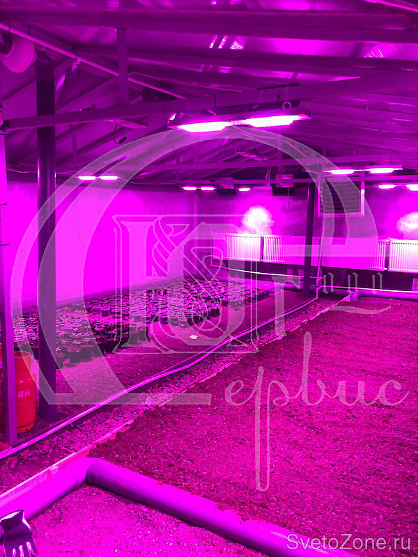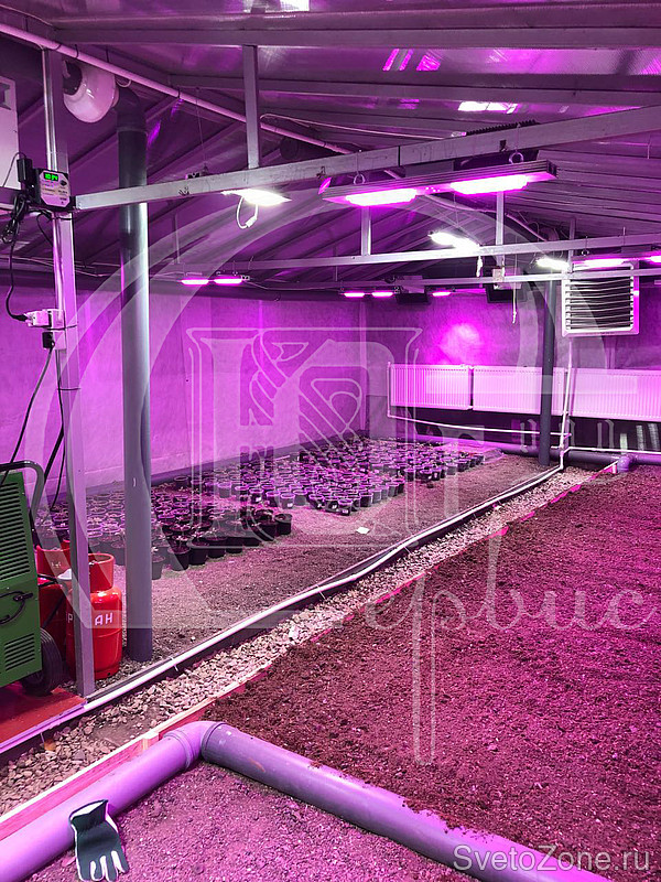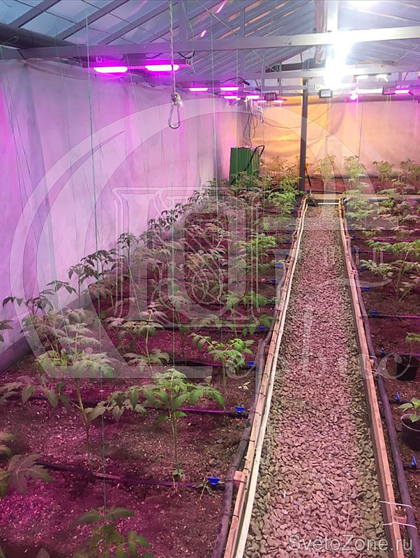 Для удобства обслуживания в темное время суток теплица дополнительно оборудована светильниками белого света ПРОМ-60Ш.