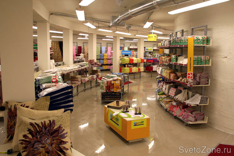 Все вышеперечисленные задачи с успехом были решены специалистами проектного отдела компании «Софит-Люкс» во время работы над освещением супермаркета домашнего текстиля «DОМОТЕКС», который расположен в Киеве на улице Кудряшова, 1А. Супермаркет находится в подвальном помещении с высотой потолков около 3-х метров, поэтому владельцы отказались от монтажа подвесных потолков, оставив открытой вентиляцию и другие коммуникации, расположенные на потолке. Поэтому специалистам пришлось на месте подбирать светильники, которые хорошо гармонировали в интерьере магазина и удовлетворили требования заказчика. В частности, необходимо было подобрать накладные светильники закрытого типа, чтобы исключить возможное повреждение ламп посетителями магазина. Кроме того, дизайн светильника не должен был напоминать промышленное осветительное устройство. После рассмотрения нескольких вариантов выбор был сделан в пользу накладных светильников Philips TCS 097 P2xTL-D 58 Вт / 840 с электронным балластом. |