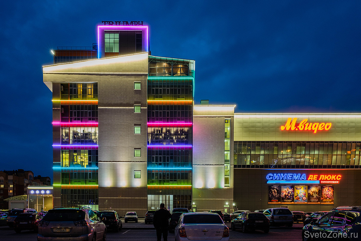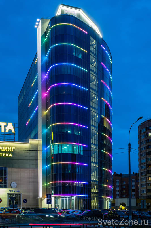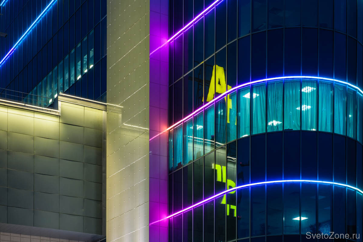 Чтобы подчеркнуть геометрию фасада ТРК, было выбрано лаконичное световое решение – линейные приборы серии IntiTUBE с поверхностью свечения 250°. В проекте использовано 737 полноцветных светильника IntiTUBE длиной 30 см, 50 см и 130 см, которые создают непрерывные световые линии. Разная длина светильников позволяет выстраивать линию по радиальной поверхности. Они эффектно выделяют межэтажные пояса здания, формируя световой ритм, что в сочетании с зеркальной поверхностью фасада создает эффектное мерцание и делает узнаваемым образ ТРК в вечернее и ночное время.
