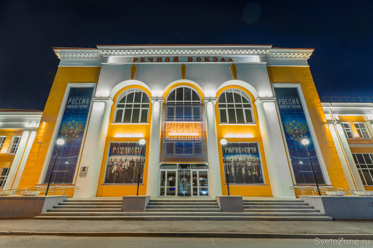 Через год, в августе 2017 г. на фасаде Речного вокзала была установлена современная светодиодная система освещения компании IntiLED. Настроение концепции продиктовано самой архитектурой здания, выдержанной в рамках «сталинского ампира». Поскольку этот стиль не предполагает большого разнообразия цветов, концепция выполнена с помощью нейтрального белого света, который одинаково хорошо сочетается с белым и желтым цветом отделки фасада. Лаконичный дизайн-проект освещения создает запоминающийся вечерний облик вокзала и подчеркивает его статус.