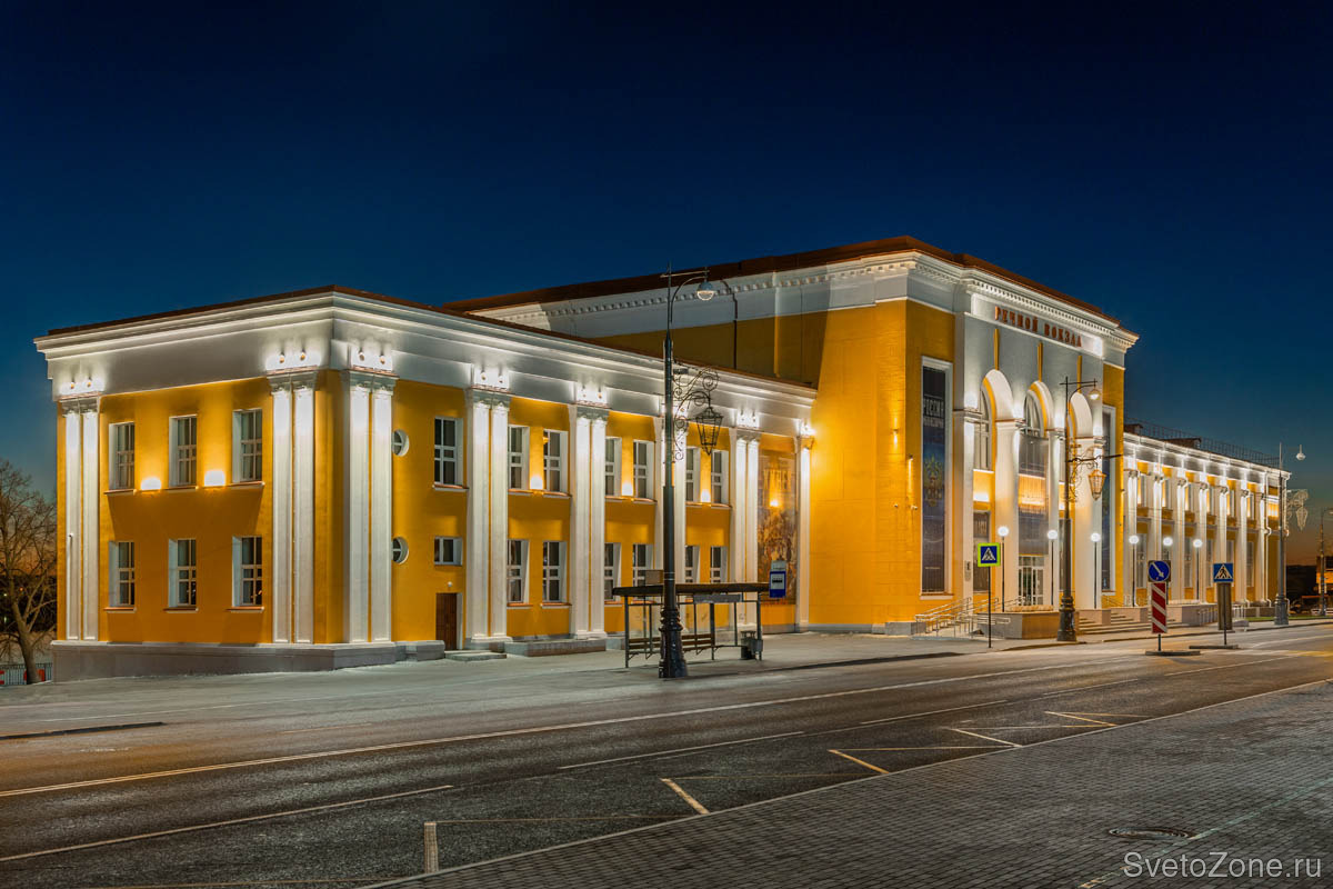 Созданная система освещения выразительно подчеркивает архитектурные элементы вокзала и создает единый световой ансамбль.