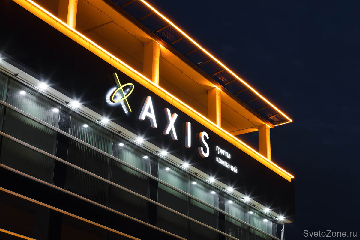Для освещения панно с эмблемой AXIS использовано четыре линейных светильника серии IntiLINE и шесть мощных прожекторов IntiSTARK холодного белого света c овальной оптикой 10x50°.