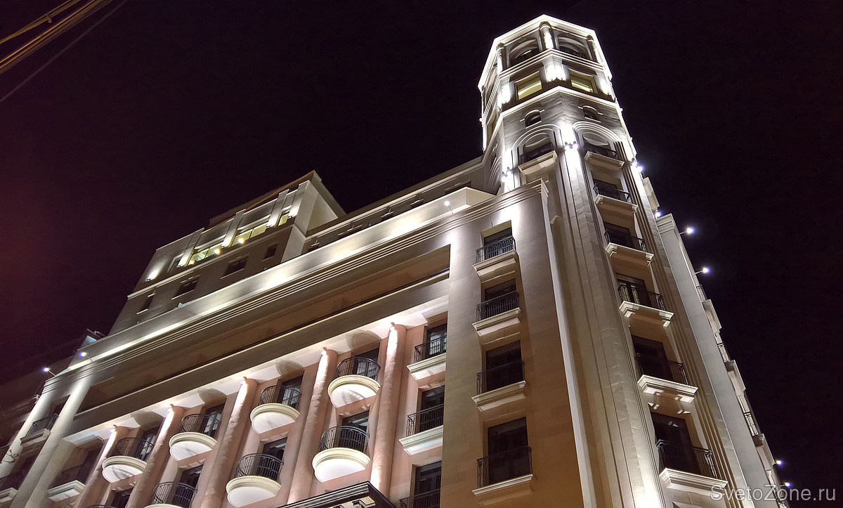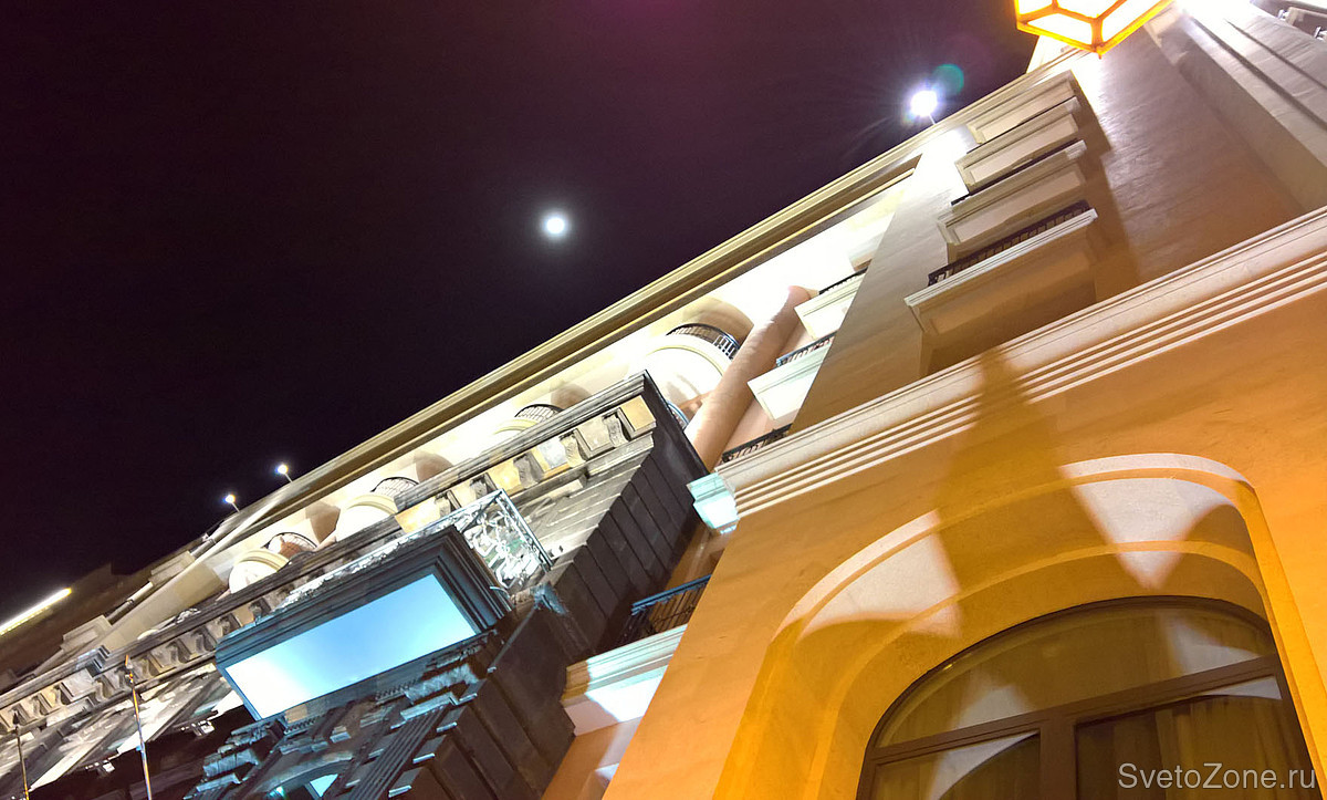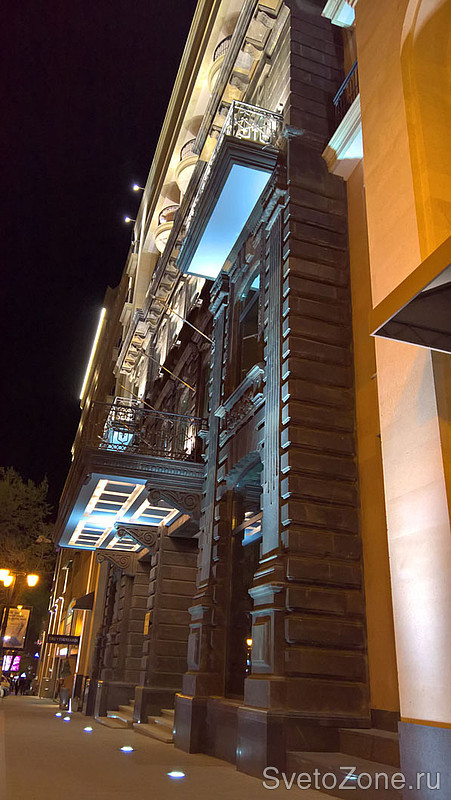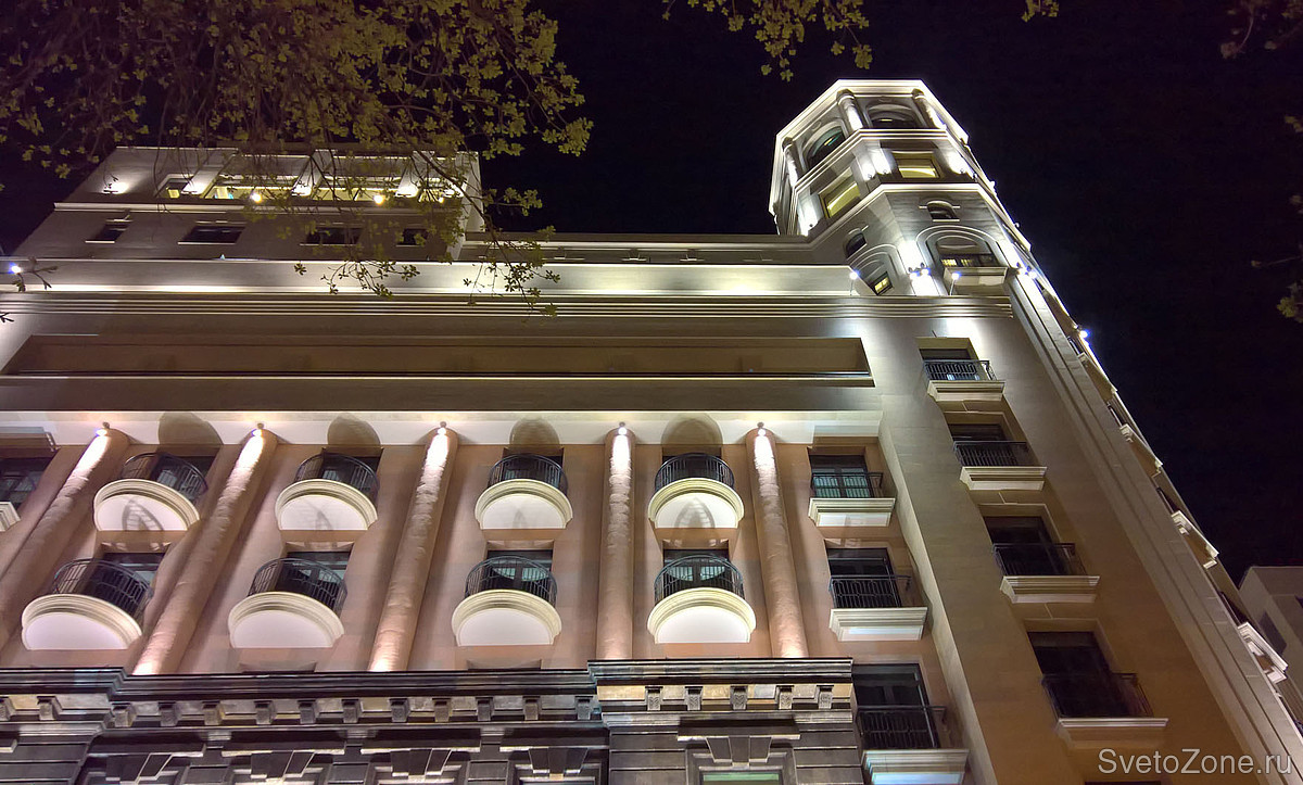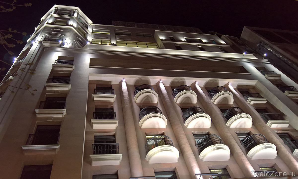 Художественная ковка ограждений балконов исторической части входной группы отрабатывается компактными светильниками линейного типа PARADE S-DW-20. Полукруглые поверхности балконов и горизонтальные поверхности верхних ярусов здания освещаются при помощи светодиодных линеек PARADE S-DW-40 и более мощных PARADE S-DW-60.