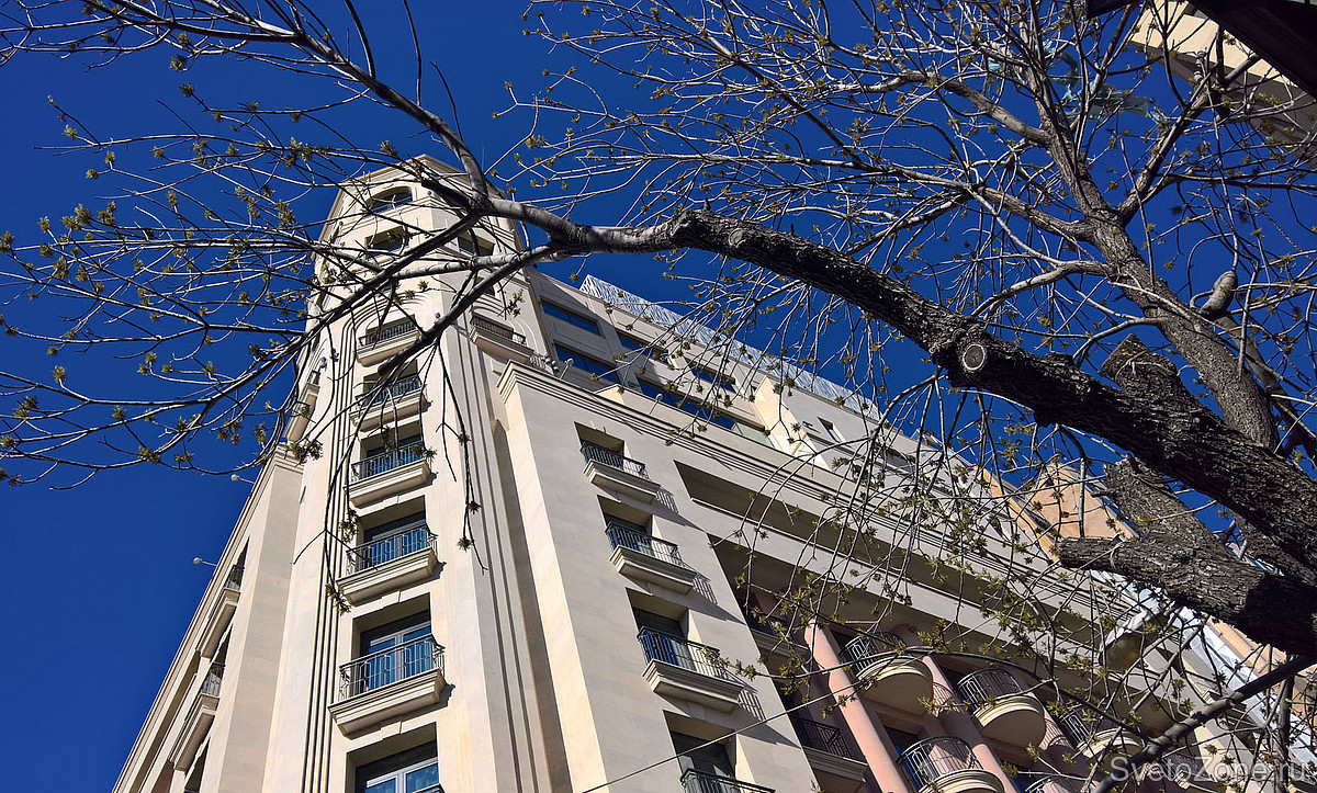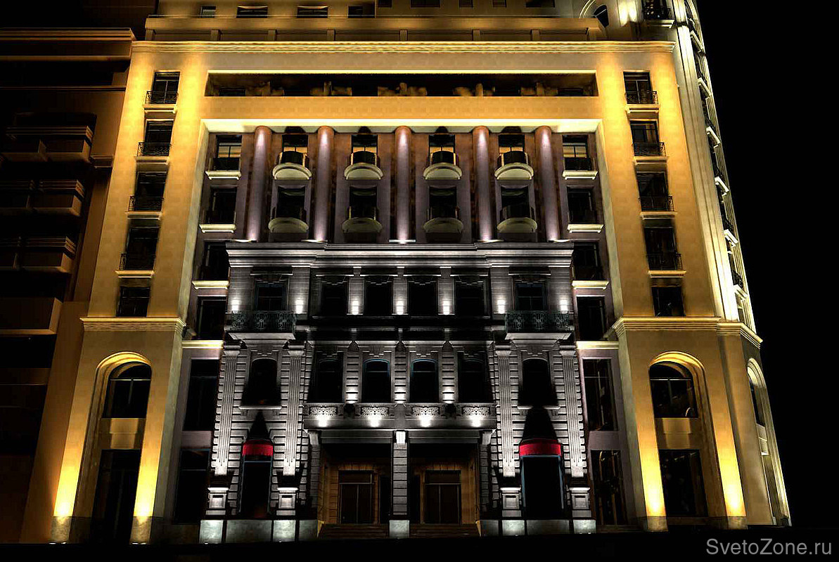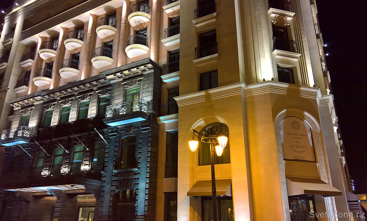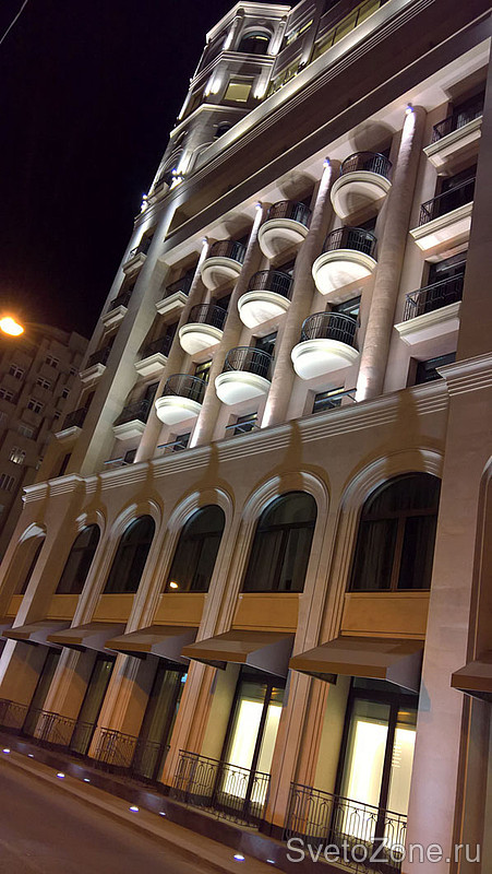 Художественная ковка ограждений балконов исторической части входной группы отрабатывается компактными светильниками линейного типа PARADE S-DW-20. Полукруглые поверхности балконов и горизонтальные поверхности верхних ярусов здания освещаются при помощи светодиодных линеек PARADE S-DW-40 и более мощных PARADE S-DW-60.