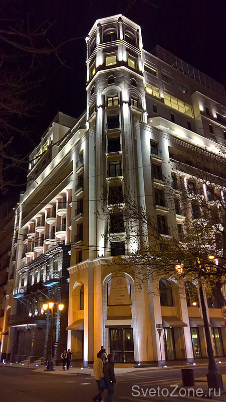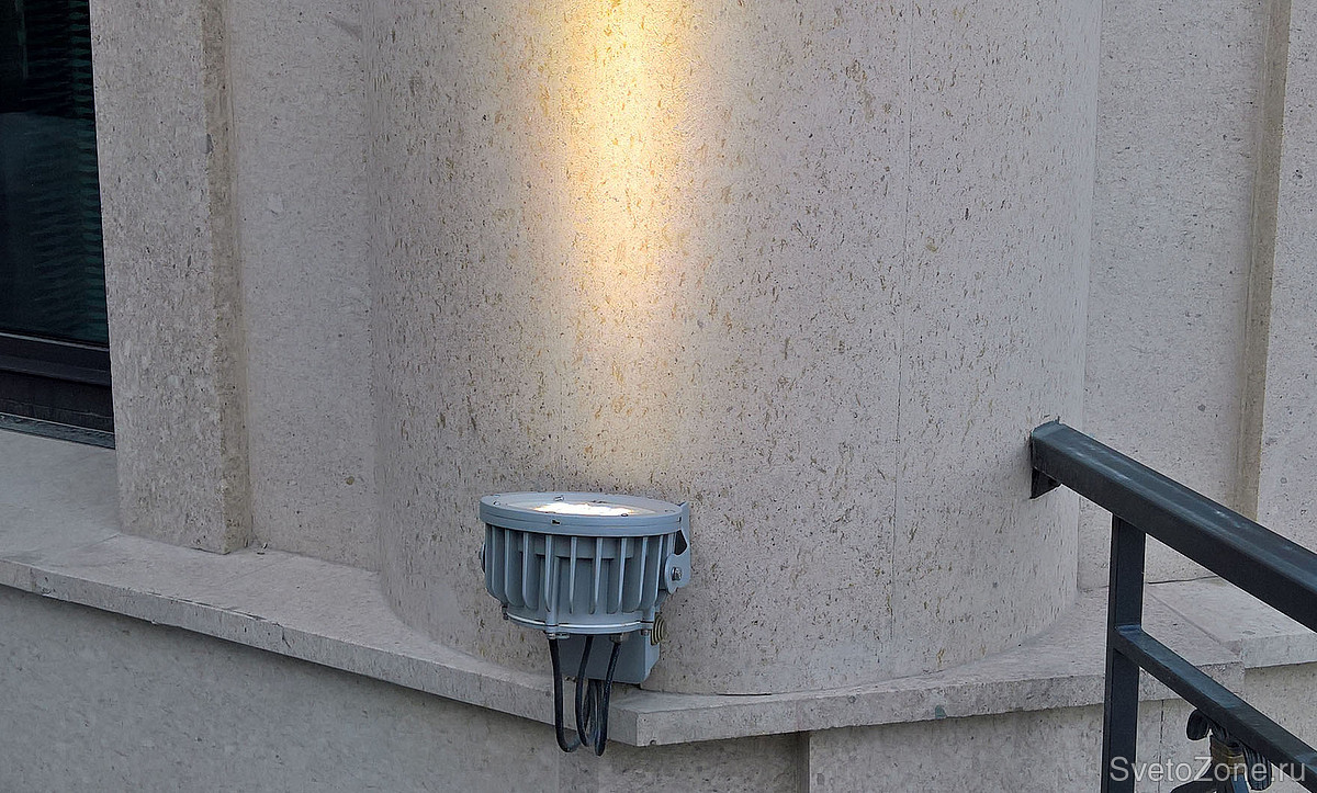 Элементы колонн, межоконные пространства, протяженные вертикальные поверхности доминирующей и самой высокой угловой части фасада, а также прочие акценты – определены компактными прожекторами в цилиндрическом корпусе JADE 16.
