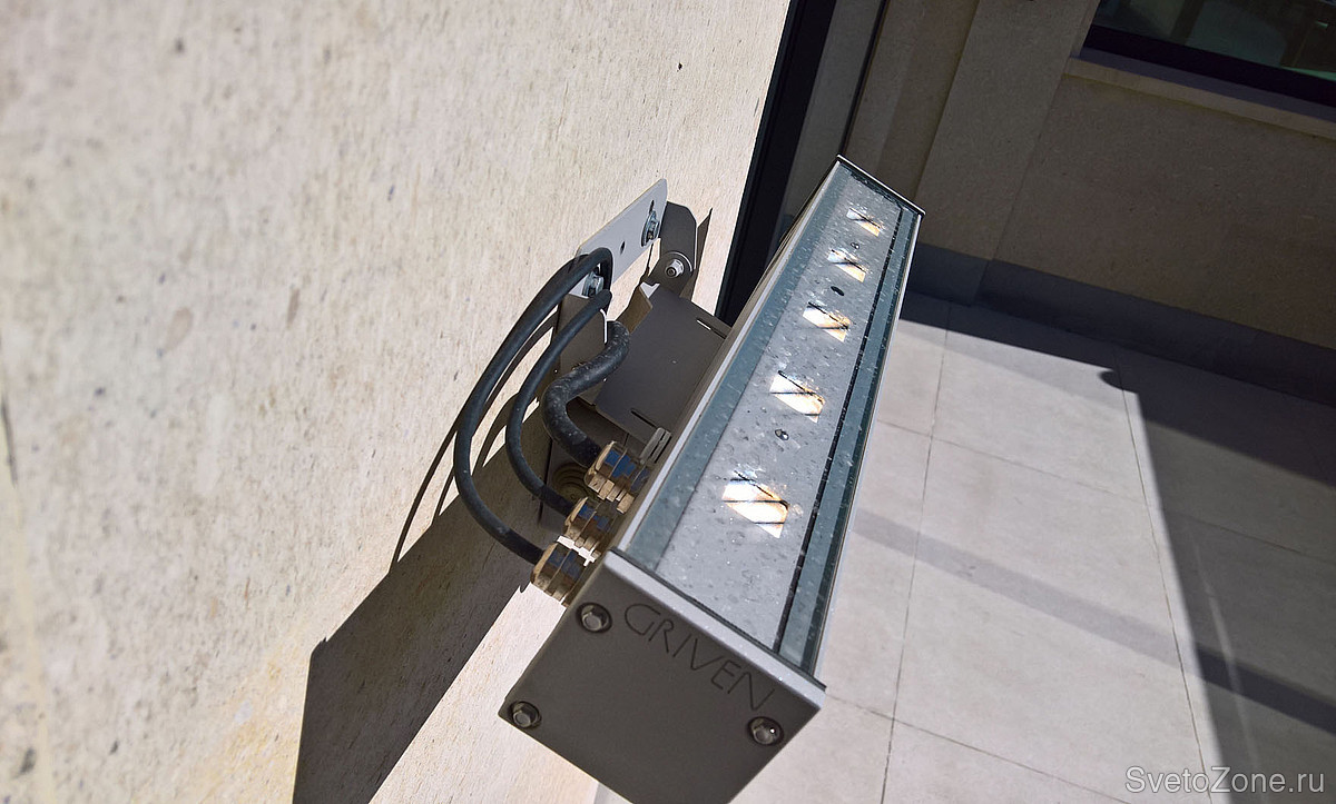 В проекте использованы приборы различных типов. Нижняя часть фасадов освещается при помощи прожекторов встраиваемого типа семейств DUNE MC и DUNE MK2. Прожекторы оснащены поворотными матрицами, что в значительной степени упрощает процесс последующего нацеливания.