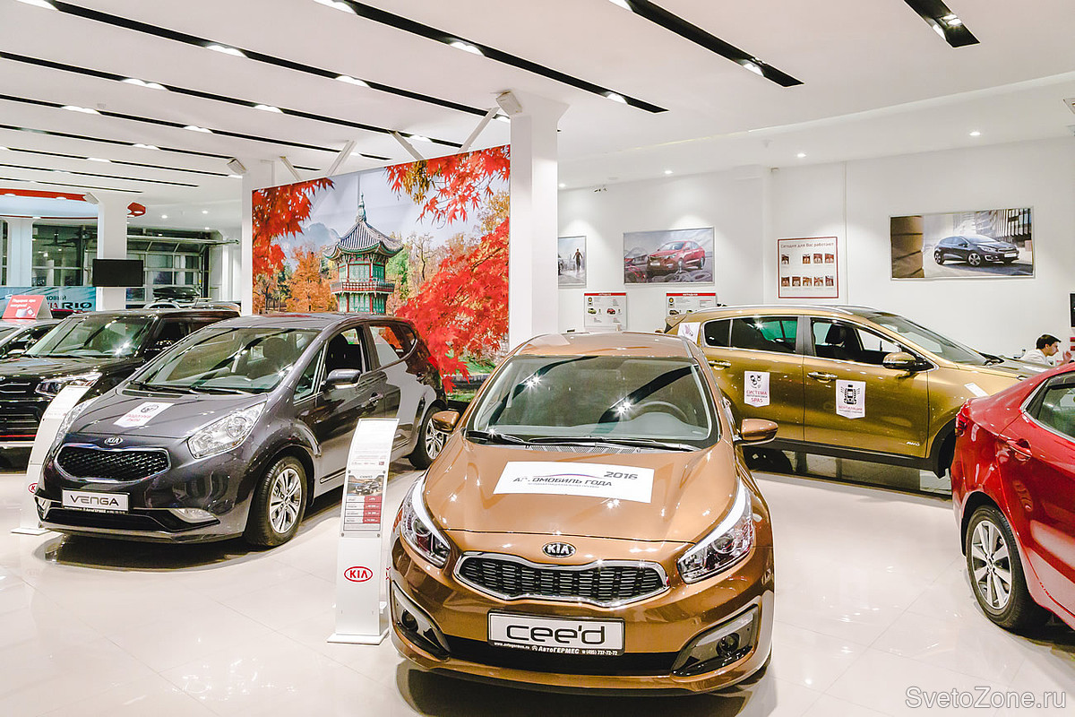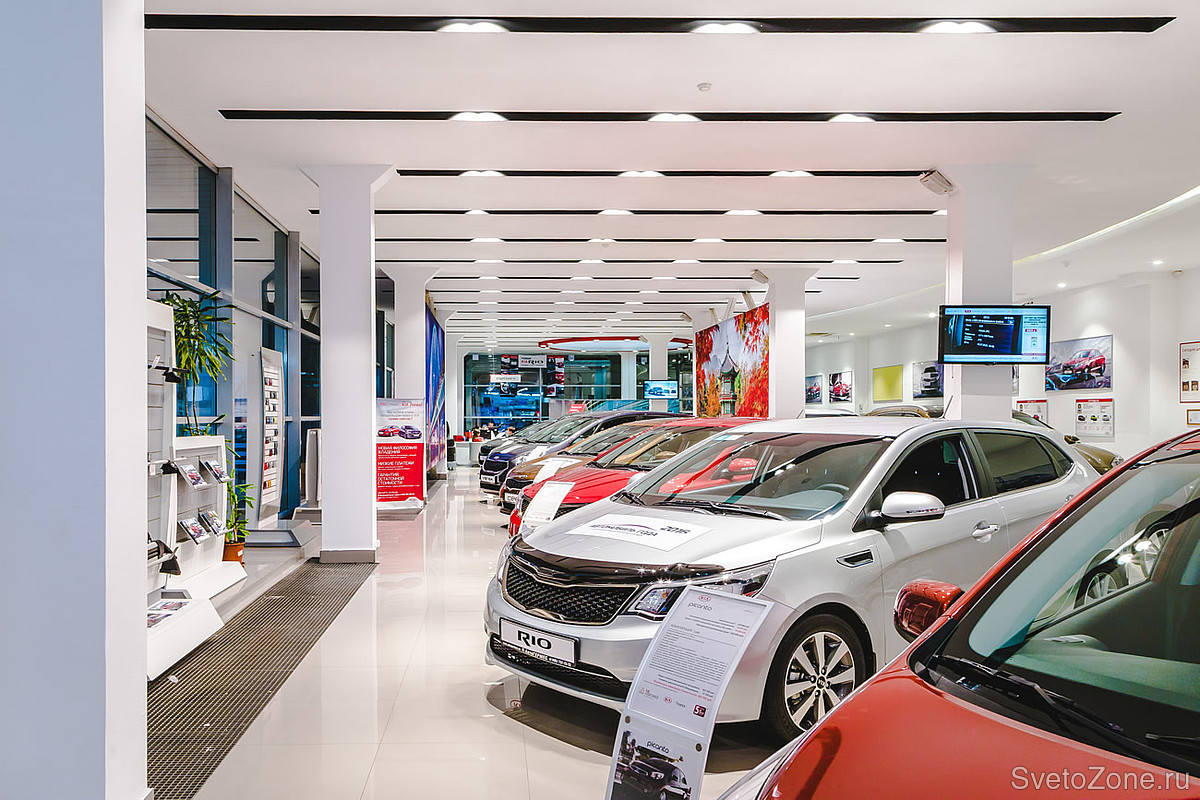 В августе прошлого года нашей компанией была осуществлена поставка светодиодных светильников для освещения выставочного зала московского дилерского центра KIA на Рязанском проспекте. Основные площади автосалона освещены двойными карданными светильниками мощностью 60 Вт каждый и с углом раскрытия 24°. Корпуса светильников по требованию заказчика были покрашены в черный цвет. Для акцентной подсветки автомобилей в остальной части шоу-рума использовались поворотные выдвижные светильники 45 Вт с углами раскрытия 24° и 50°. Все светильники имеют теплый белый свет 3000К. Для подсветки декоративной ниши на потолке использовалась светодиодная лента, размещенная на алюминиевой подложке. Мощность ленты 18 Вт/м, а рабочее напряжение 24V.