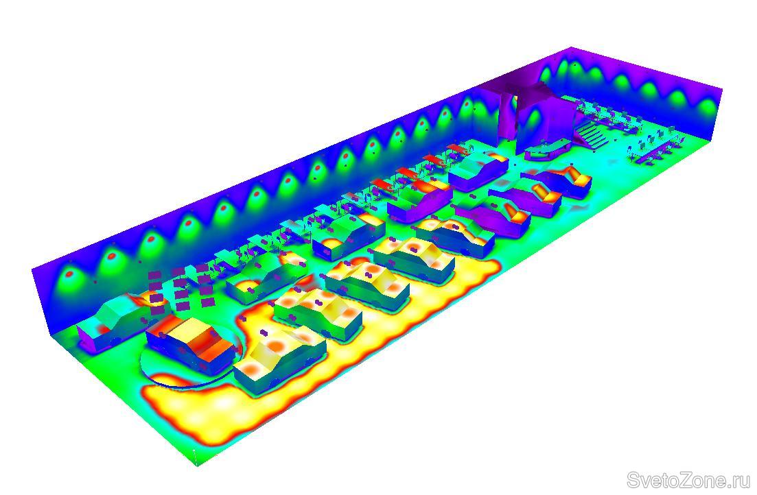 Средняя освещенность в выставочном зале составила 900 люкс. При этом непосредственно на автомобилях освещенность достигала 2450 люкс. В зоне работы персонала средняя освещенность на рабочих местах составила 450 люкс. |