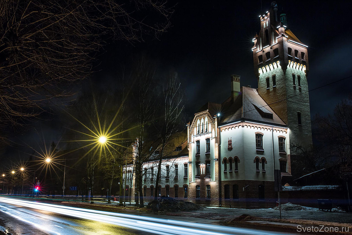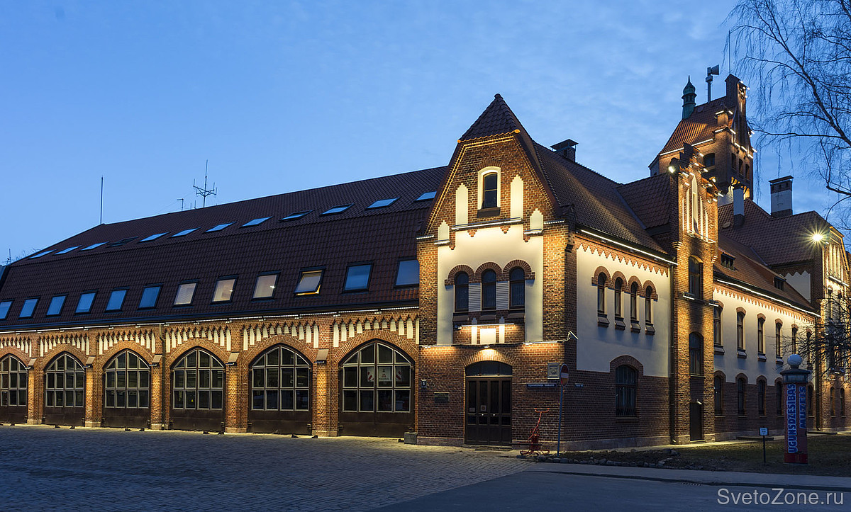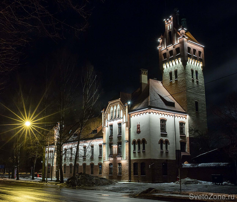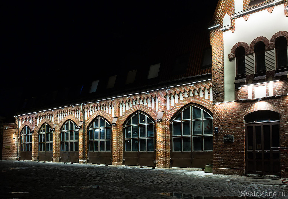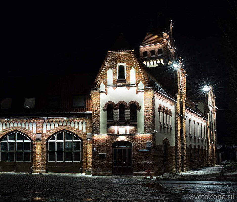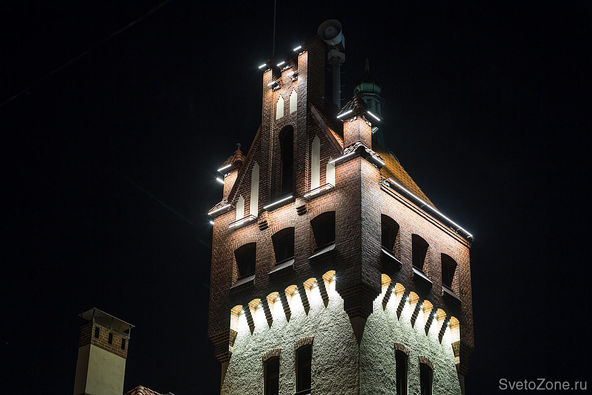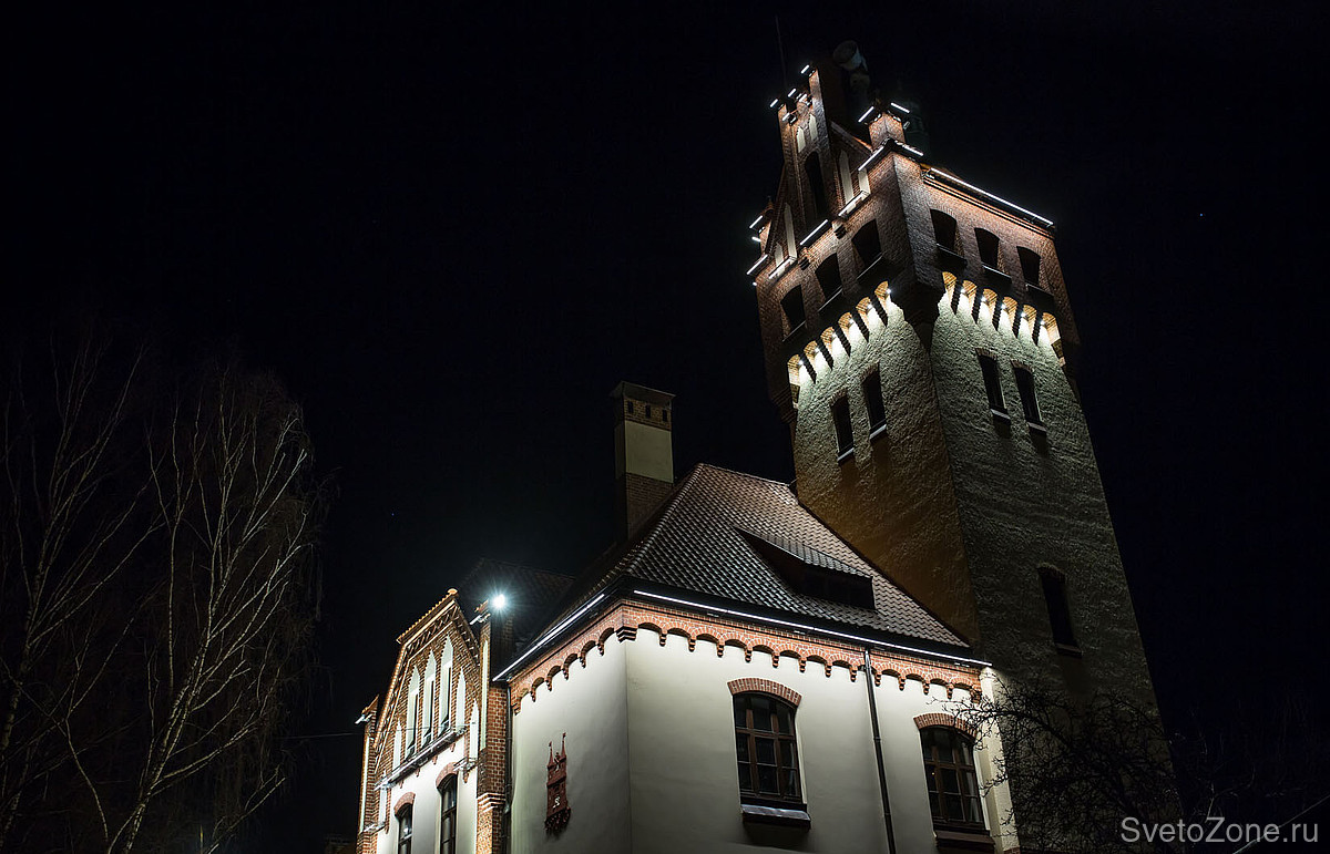 LED светильники линейного типа GRIVEN PARADE D-W-6/9/12 в исполнении с диодами теплого белого цвета смонтированы в последовательности, методично повторяющей основные архитектурные особенности фасадов, и обеспечивают равномерное освещение. Более длинные приборы установлены по линии нижнего края скатной крыши и работают по поверхностям стен. Более короткие линейки размещены в верхних частях главной башни и расставляют световые акценты на основных архитектурных формах. |