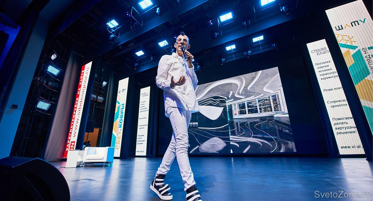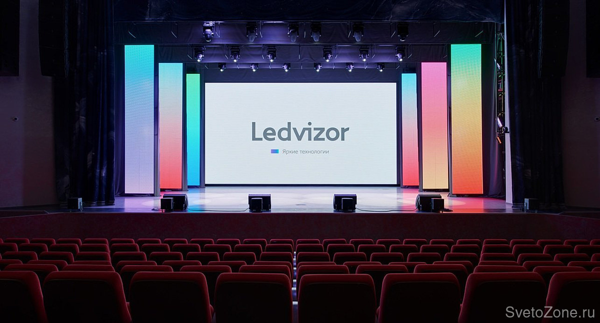 Габариты центрального экрана: Длина – 11,5 метров. Высота – 6 метров. Разрешение 1920х1024 с шагом пикселя 6 миллиметров Размер кулис (6 штук): Длина – 1,2 метров. Высота – 6 метров. Разрешение: 96х480 |