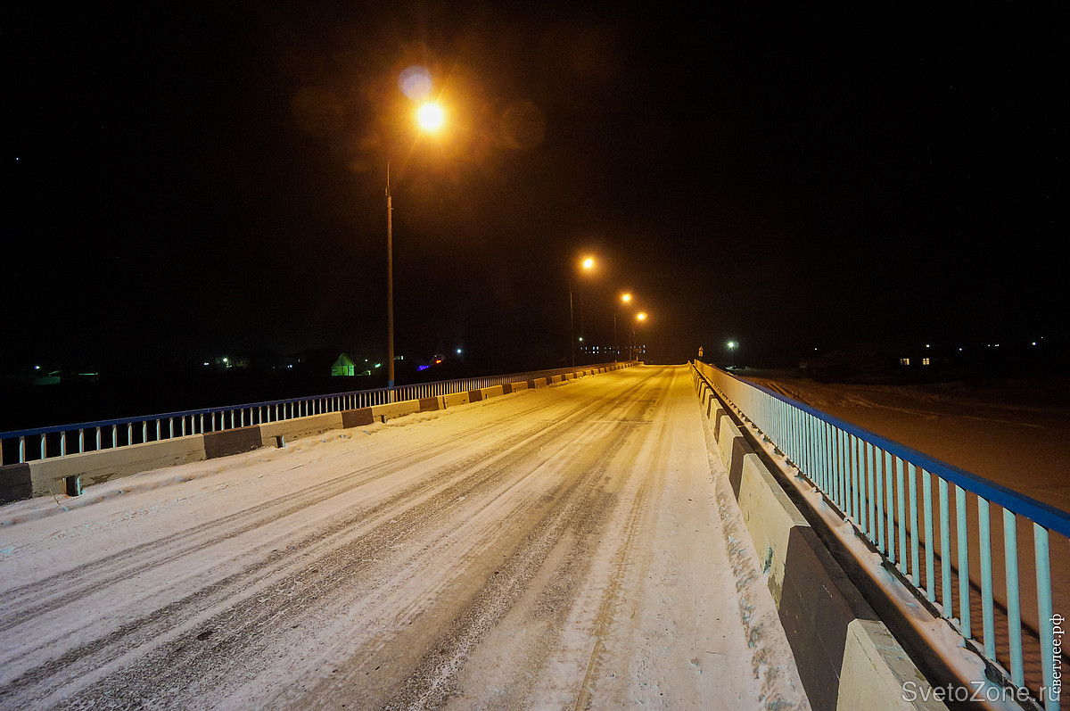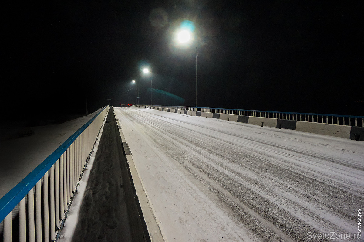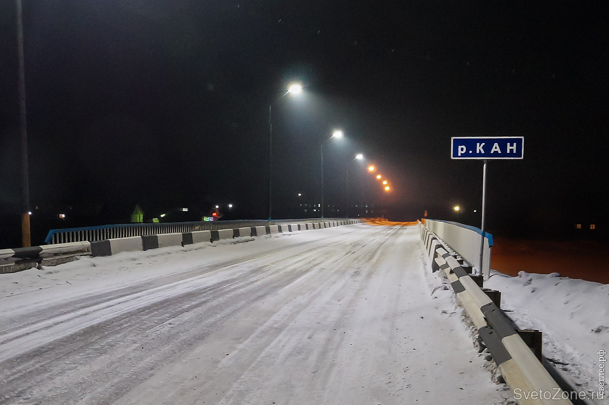 Задача: «Управление автомобильных дорог по Красноярскому краю» решило сравнить в полевых условиях эффективность светодиодных светильников и газоразрядных приборов с лампами ДНАТ-150. Испытательным полигоном стал мост через сибирскую реку Кан.