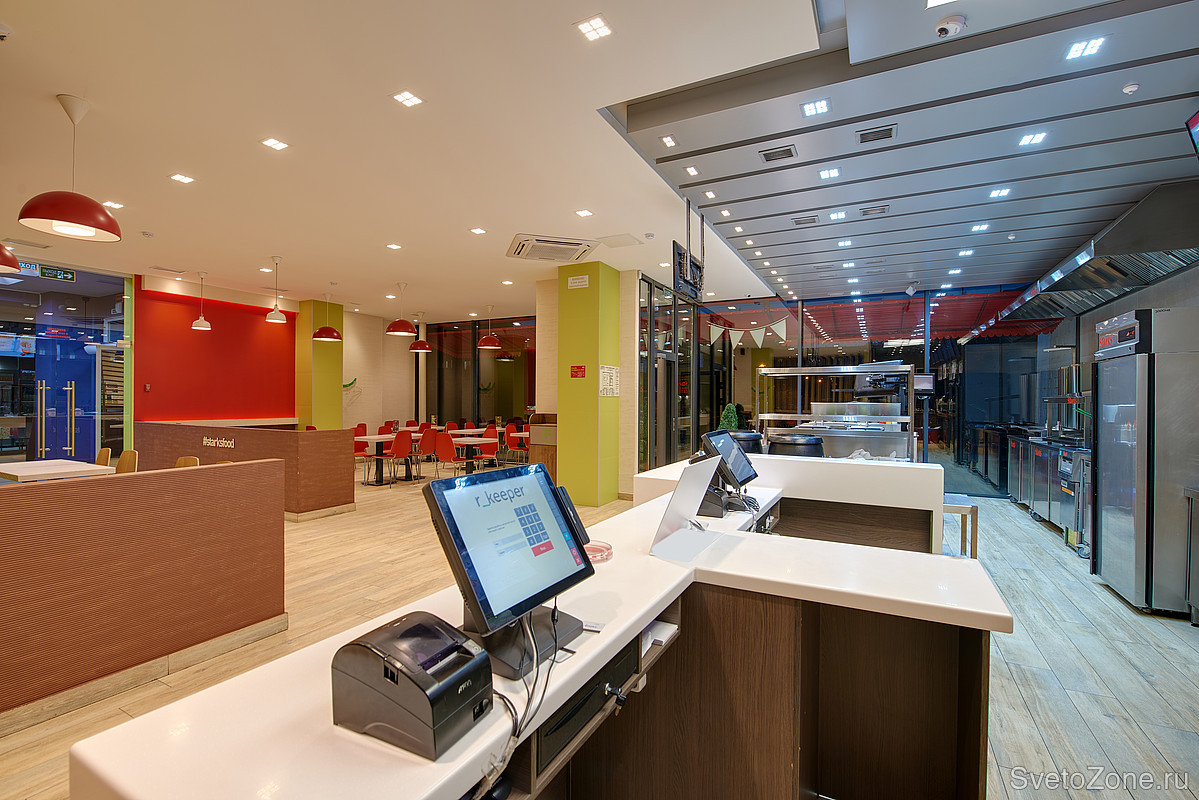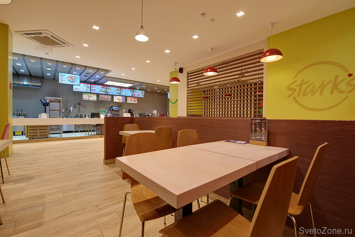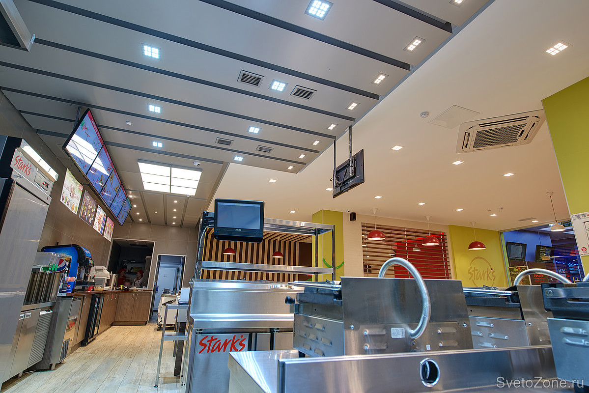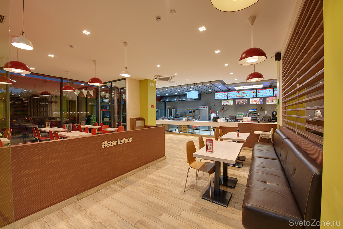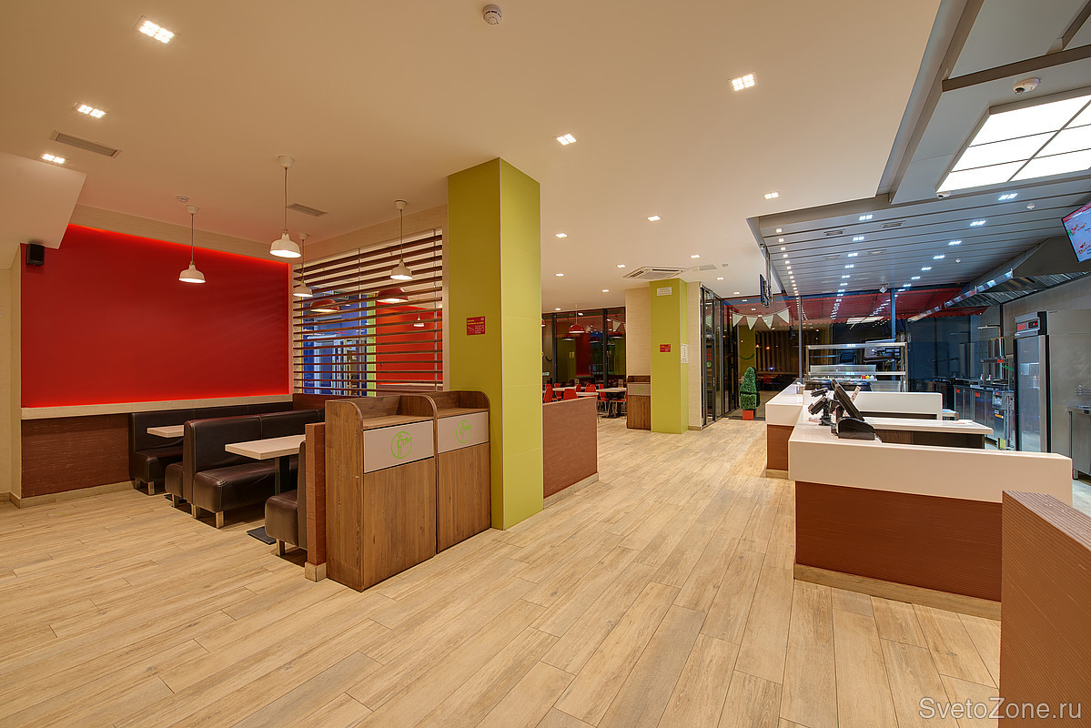 Задача: Открывая сеть ресторанов быстрого питания, её владельцы решили разделить кухонную и клиентскую зоны, используя температуру света. Компанию Ledvizor пригласили для разработки и последующей реализации концепции освещения.