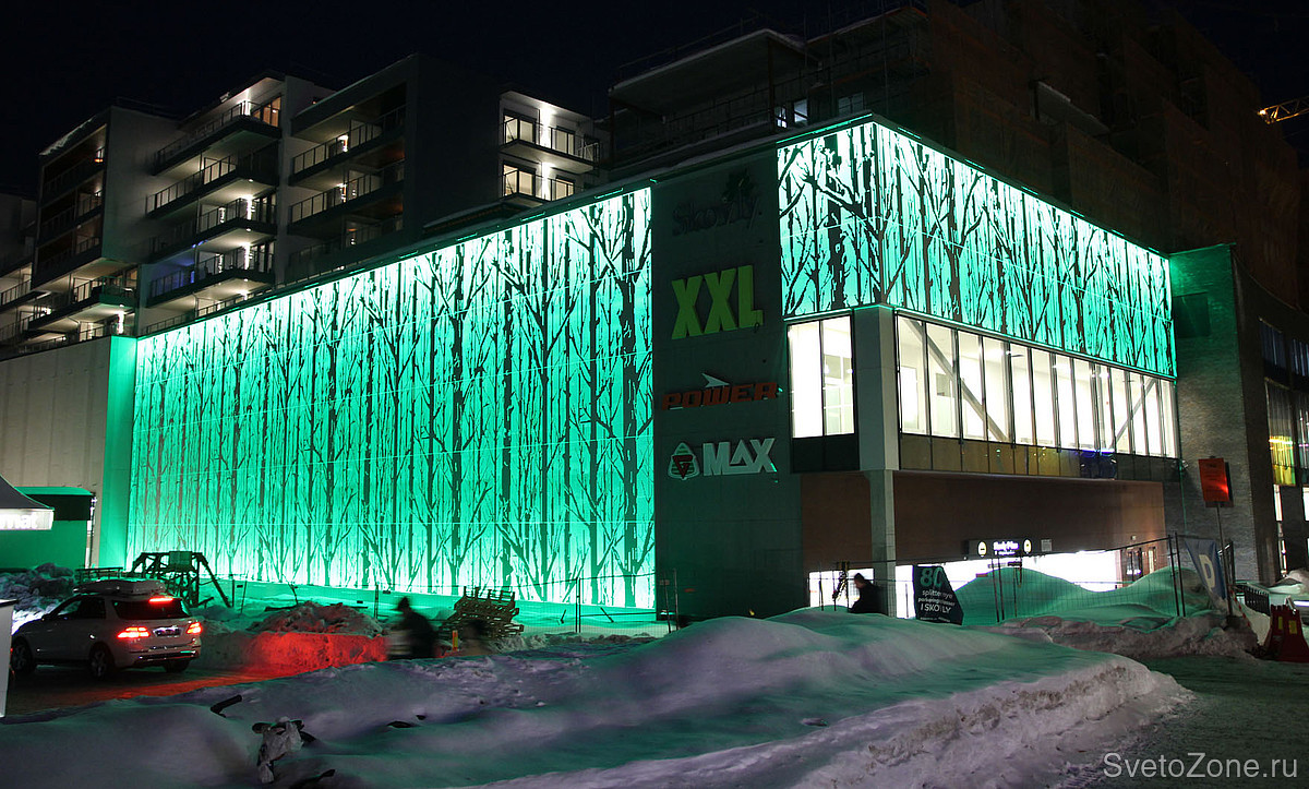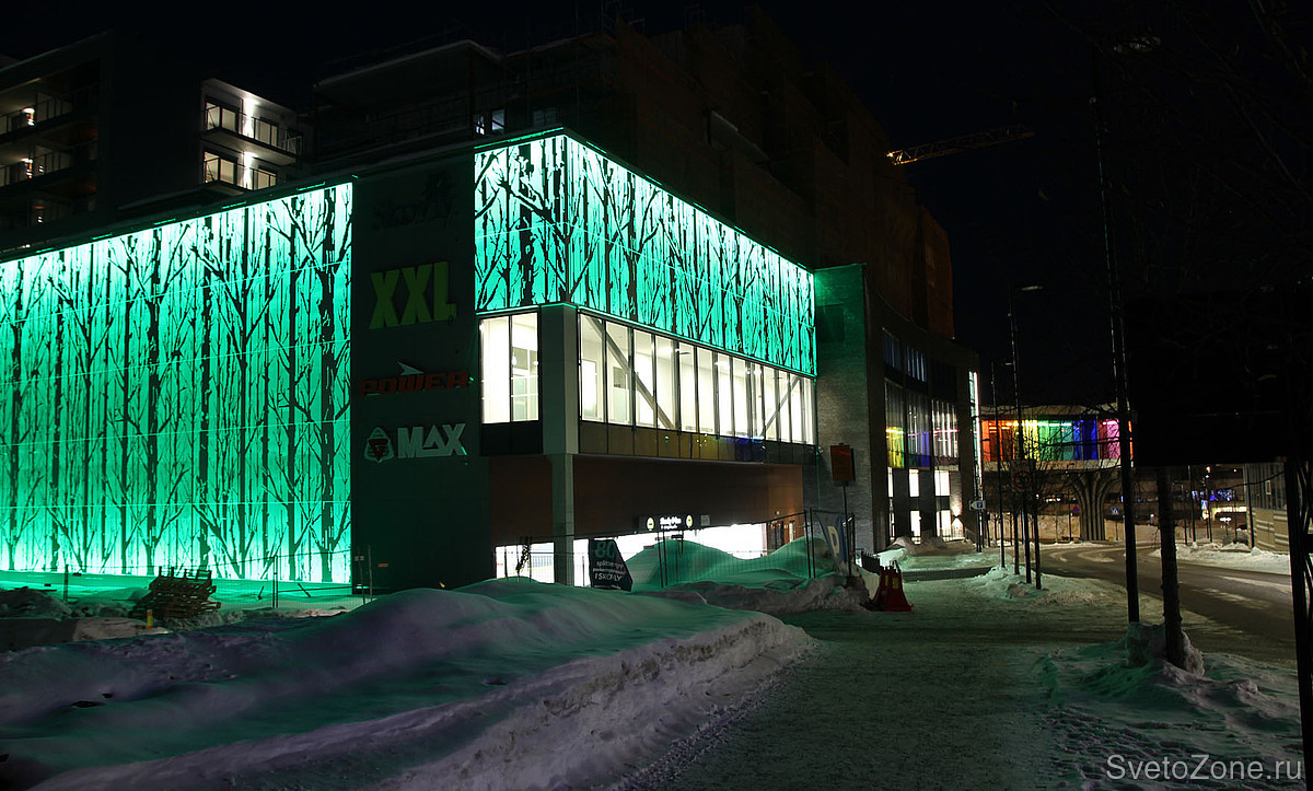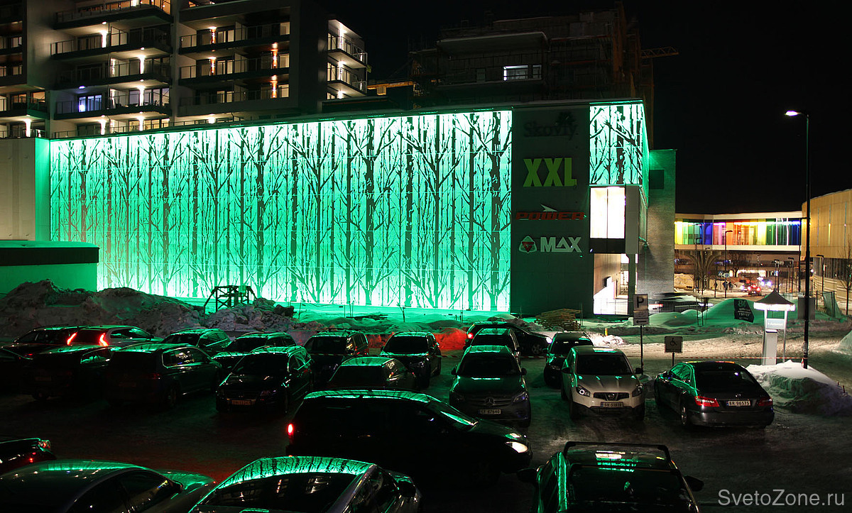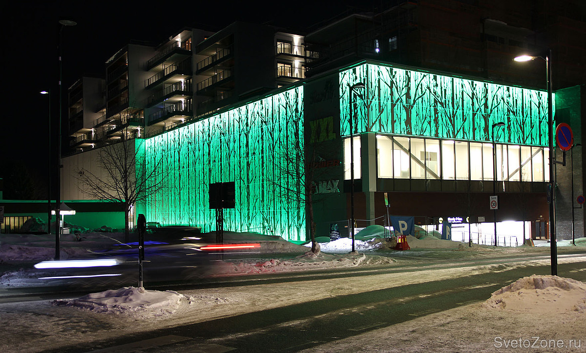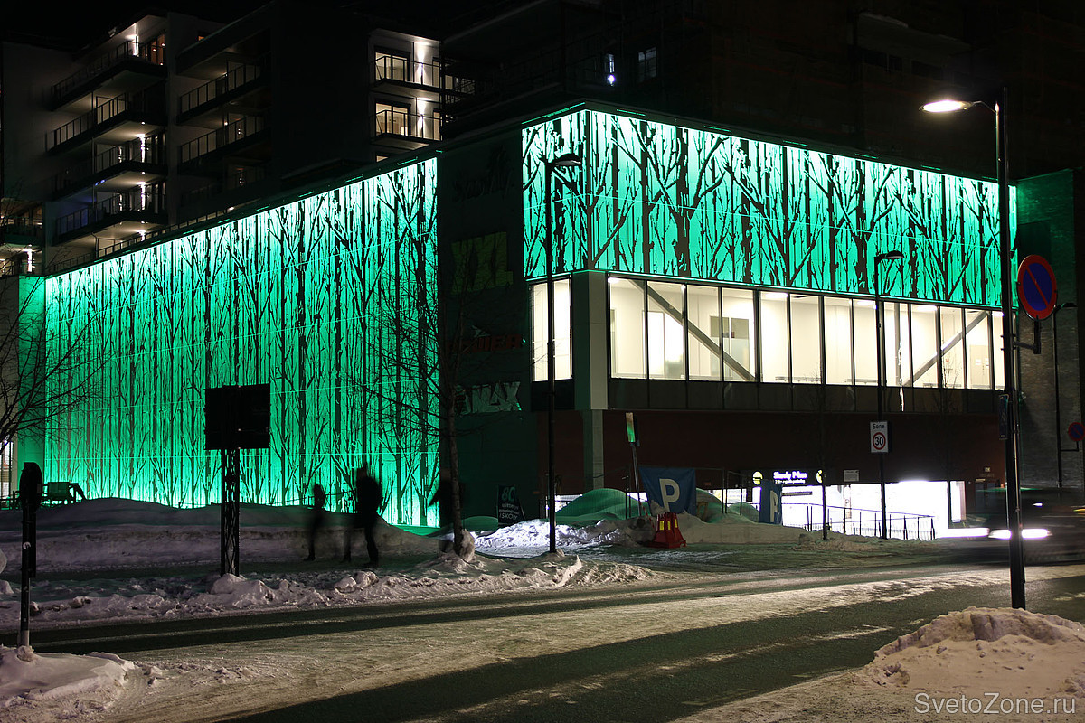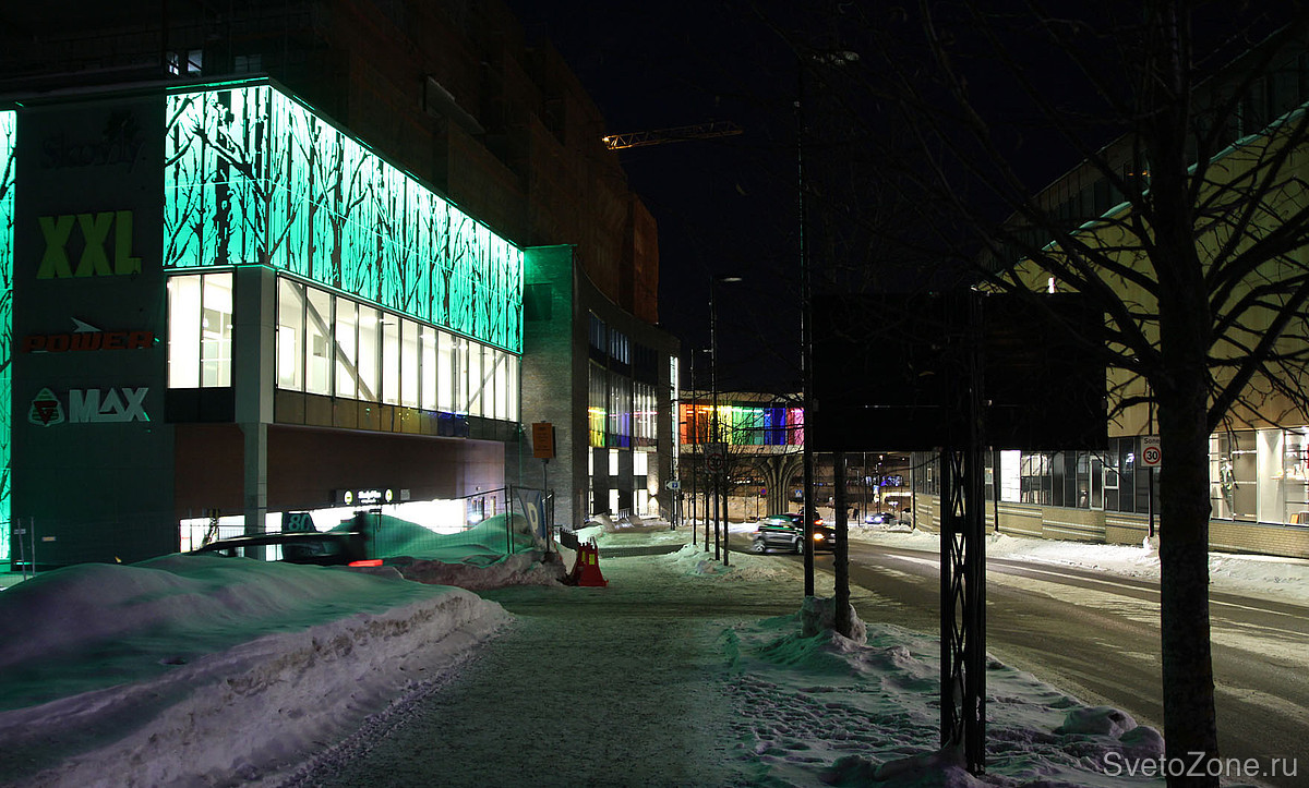 Оригинальная концепция освещения разработана и предложена для многофункционального комплекса Skolvy Senter. Художественная составляющая реализована при помощи использования перфорированных металлических панелей, размещенных на некотором расстоянии от стеклянных фасадов здания. Древовидная структура формирует регулярно повторяющийся рисунок, олицетворяющий лесную растительность, четко читающийся в темное время суток и рельефно усиленный за счет завораживающей игры света и тени. Световые приборы работают "на просвет" и четко выделяют силуэты деревьев.