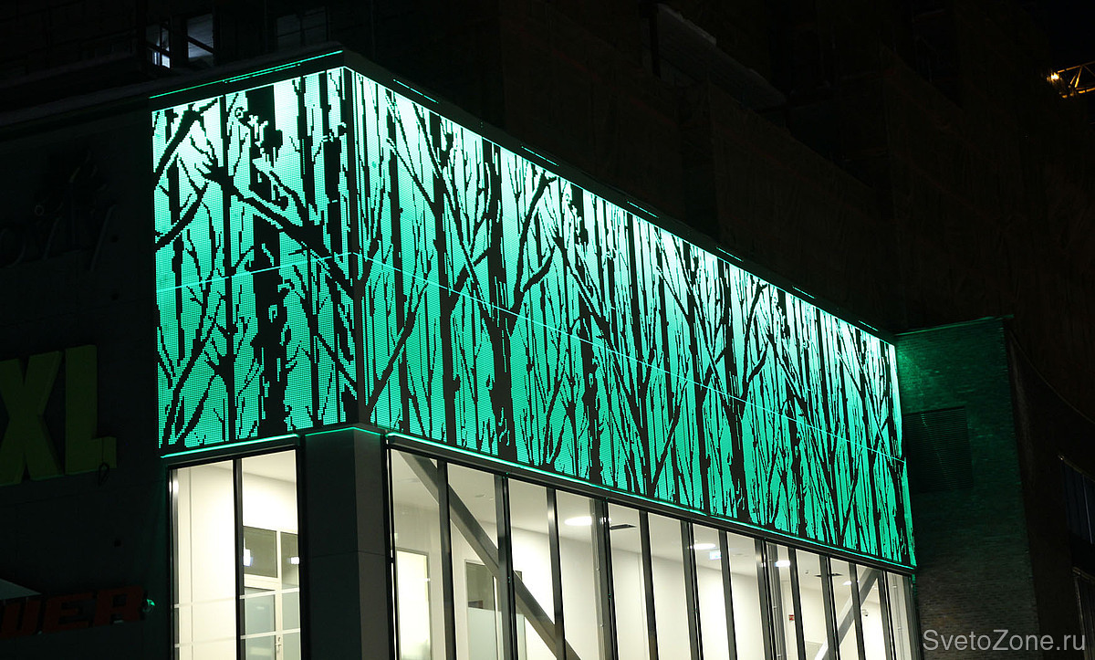 Проект реализован на мощных светодиодных линейках GRIVEN PARADE серии X (126 Вт/м) с системой синтеза цвета RGBW. Пожалуй самым сложным моментом в достижении задуманного эффекта стал подбор расстояний между стеклянным фасадом, перфорированными панелями и расположением (нацеливанием) световых приборов. В рамках реализации проекта огромное внимание уделено предваряющим натурным испытаниям, проведенным на специально собранном макете фрагмента фасада. В попытке создания гармоничной связи с привычным ощущением восприятия леса, в качестве основного цвета для главного сценария световой инсталляции выбран зеленый цвет. При этом микшер цветов RGBW и функционал светодиодной линейки PARADE X позволяют менять оттенки зеленого и при необходимости воспроизводить плавные цветовые переходы, меняя внешний облик объекта в праздничные дни.