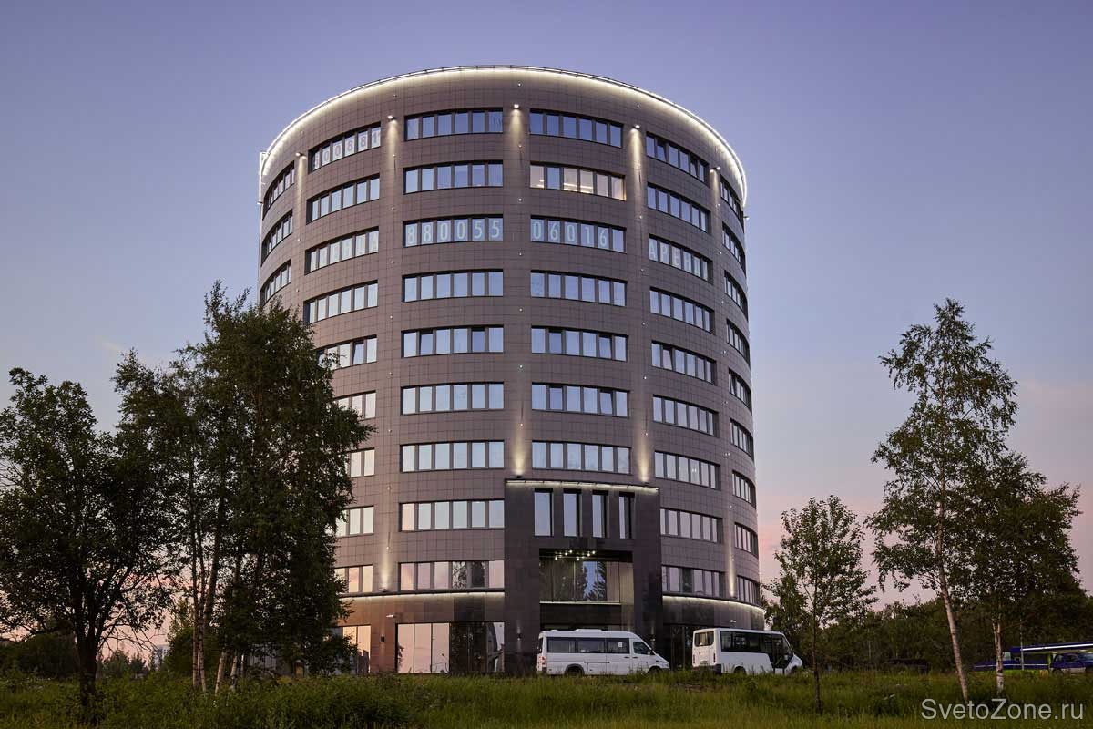 Функцию акцентирующего освещения выполняют светильники серии IntiSTARK и IntiPOINT. Мощные 7-градусные прожекторы IntiSTARK холодного белого цвета расположены по периметру первого и десятого этажа. Построенные ими световые линии выделяют межоконные проемы, образуя вертикальный ритм. Декоративное освещение создано благодаря точечным RGB-светильникам серии IntiPOINT. Каждый светильник управляется индивидуально по стандартному протоколу DMX-512. Это позволяет создавать различные световые сценарии, что привносит динамику в статическое освещение.