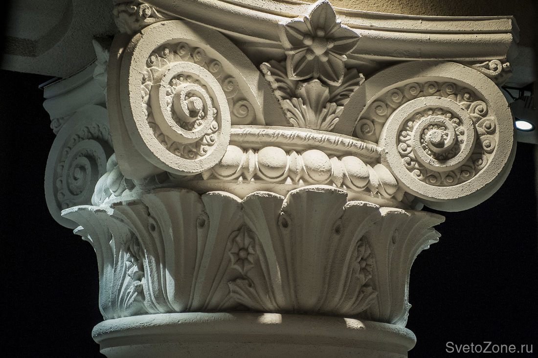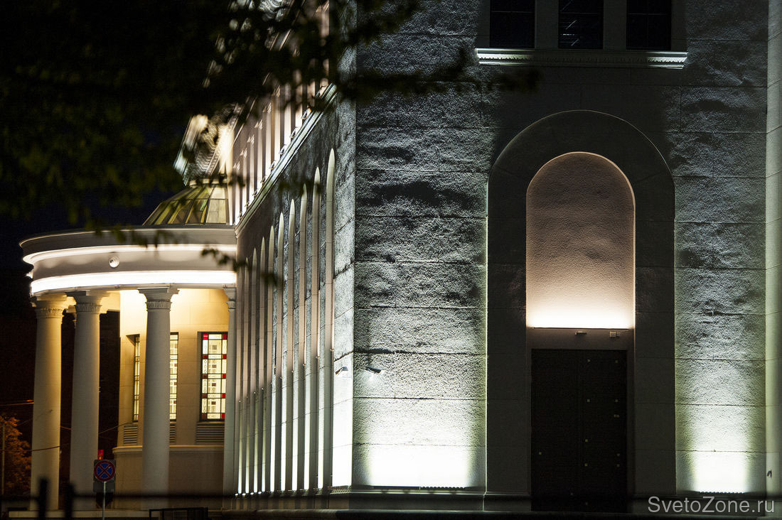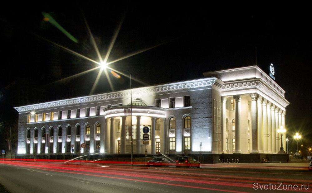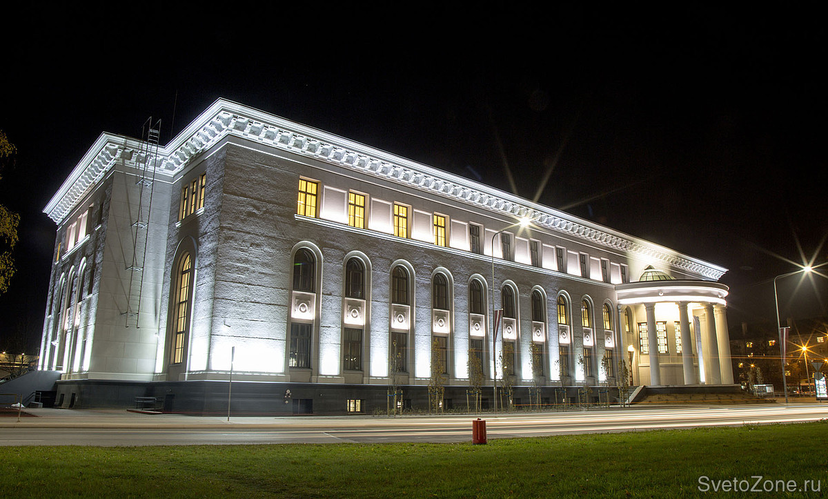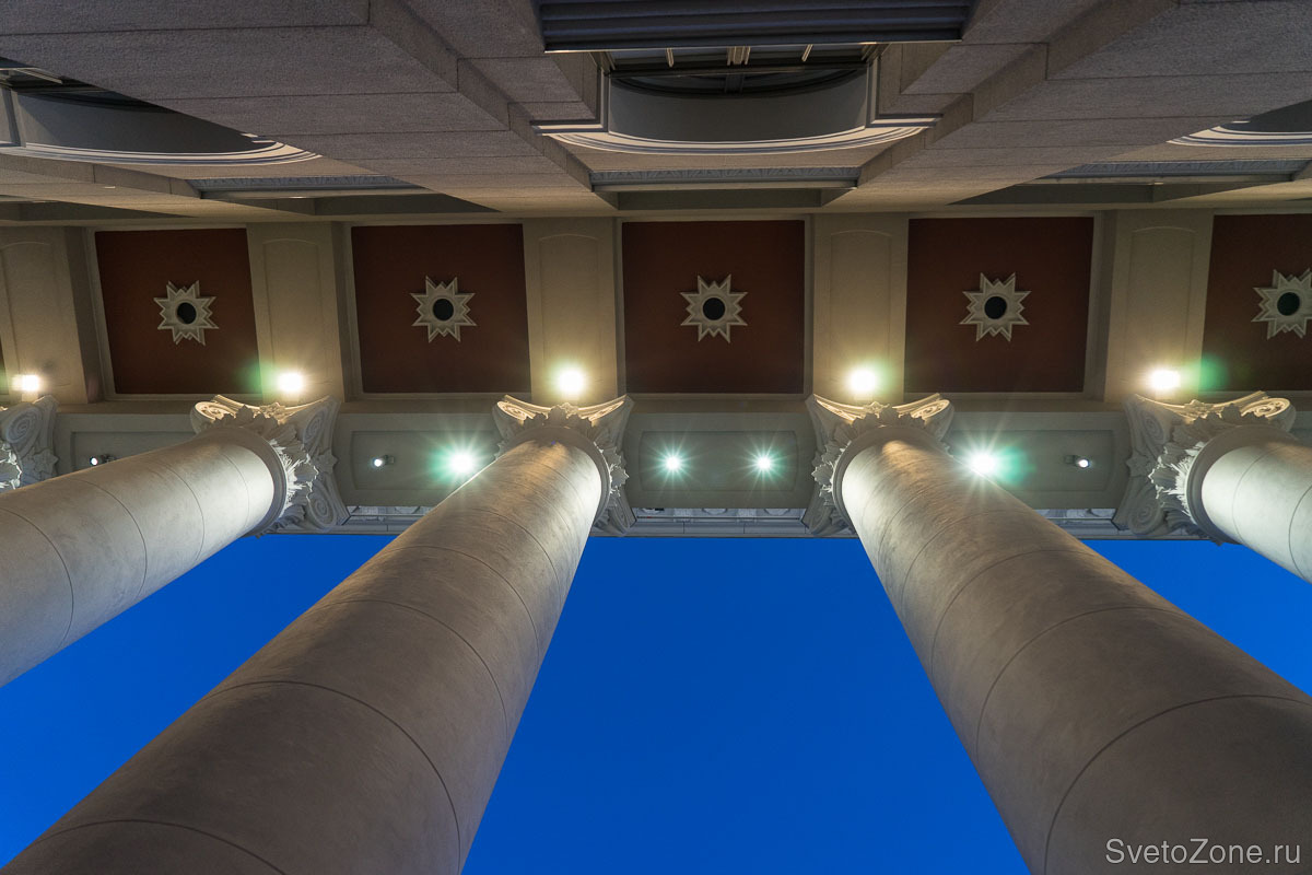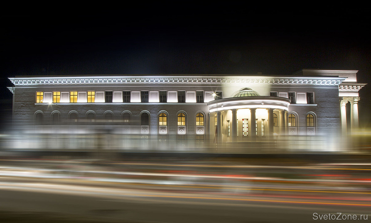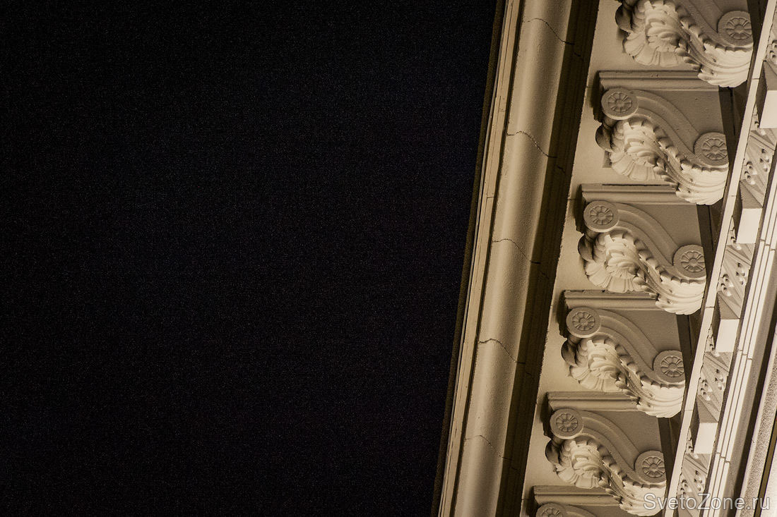 Светодиодные светильники линейного типа GRIVEN PARADE D-W-12 MK3 в исполнении WARM WHITE (теплый белый) выбраны для освещения колонной части центрального и боковых портиков, в то время как линейки PARADE D-W-12 MK3 с диодами холодного белого цвета заливают остальные поверхности фасадов. Простая и в то же время эффективная схема, построенная на умелом чередовании оттенков белого, создает элегантное и сдержанное визуальное восприятие городской доминанты в темное время суток.