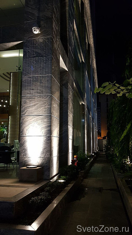 Отдельного внимания заслуживает способ освещения нижней части здания и входной группы, отделанной изысканным коллекционным мрамором. В связи с отсутствием возможности установки прожекторов встраиваемого типа в дорогой камень отмостки, инженерами разработаны и выполнены малые архитектурные формы, представляющие собой изделия кубической формы, сконструированные из кирпича и бетона, с финишной отделкой дизайнерской штукатуркой. Малые формы предназначены для установки "грунтов" GRIVEN DUNE MK2, которые в итоге и смонтированы в количестве 14 штук. Так называемые "вазоны" с прожекторами равномерно распределены у колон вдоль входной группы и боковых фасадов здания, и формируют элегантную сбалансированную световую схему с акцентом на структуре мрамора. Нижний пояс освещения гармонично дополняет общую картину и обеспечивает спокойное очарование целостностью визуального восприятия объекта в темное время суток.