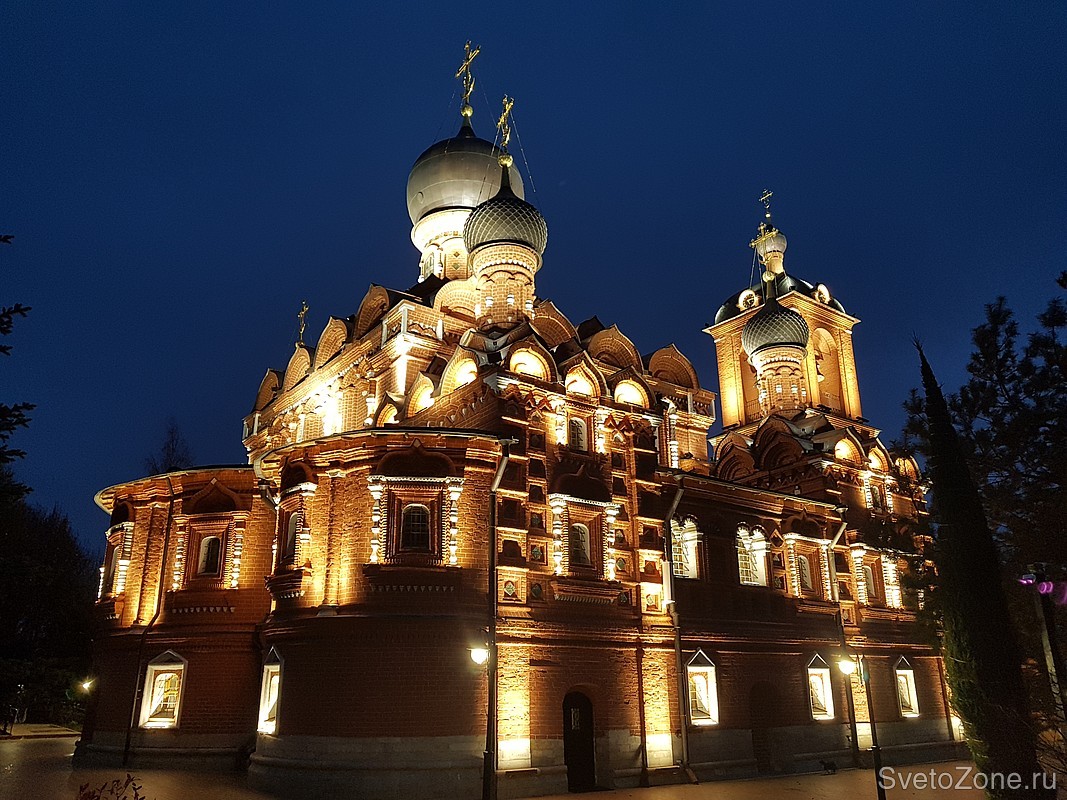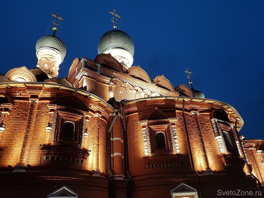 Внешний декор храма, в стиле русского узорочья, акцентирован холодным белым цветом (5000 K). Многоярусные кокошники монастыря освещены линейными светильниками серии IntiSLIM с овальной оптикой 45x18°. Компактные прожектора серии IntiTOP и IntiROLL выделяют многочисленные наличники окон. Особое внимание уделено куполам храма. Они равномерно освещены мощными прожекторами серии IntiSTARK, световой поток которых направляет храм зрительно ввысь. Этот эффект ассоциируется с возвышенностью и святостью культового сооружения. Все светильники окрашены в «антик медь» – в цвет фасада.