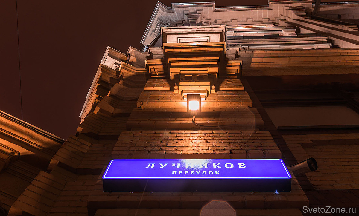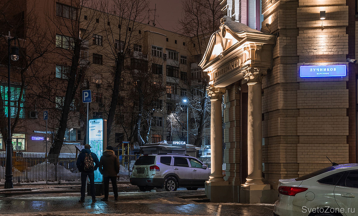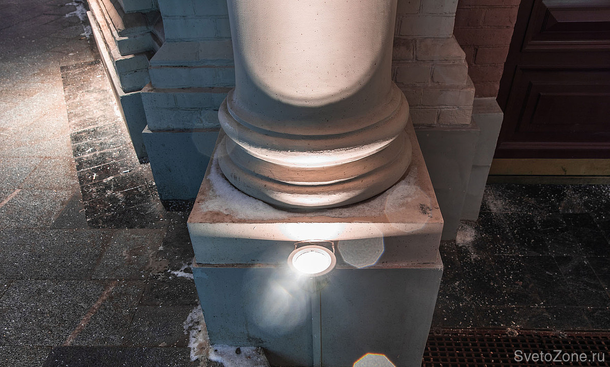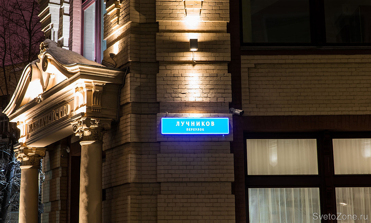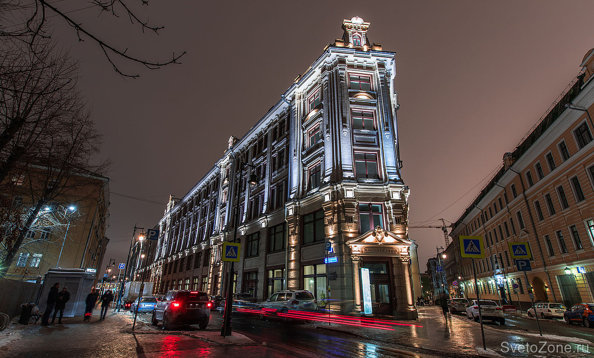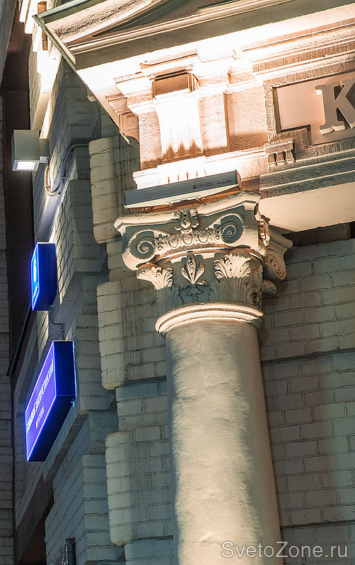 Наибольшую площадь фасадов составляет неоштукатуренная кирпичная кладка из цветного силикатного кирпича в два цвета по Златоустинскому и Лучникову переулкам, без штукатурки, с декоративной подрезкой швов. Цветной силикатный кирпич — непростой материал для подбора идеального оттенка белого света. Именно этим объясняется использование в вертикальных межоконных "прострелах" прожекторов RUBY DYNAMIC WHITE. На фото видно, как по-разному выглядит и воспринимается идентичный элемент при освещении различными оттенками белого. Другие световые акценты на элементах декора фасадов расставлены при помощи компактных светодиодных светильников MICRO-CLIP и светодиодных линеек PARADE S. Арки больших панорамных окон первого этажа мягко выделены светильниками EKLIPSE. Для освещения колонн нижнего уровня используются светильники типа "up/down" ORPHEO с узкой оптикой для нижнего модуля и широкой — для верхнего.