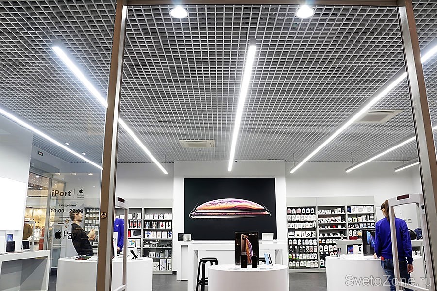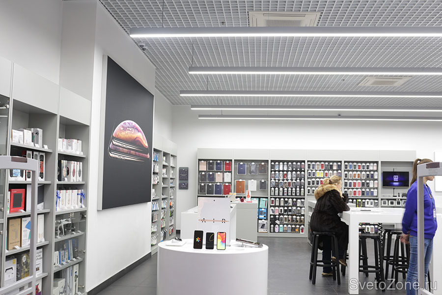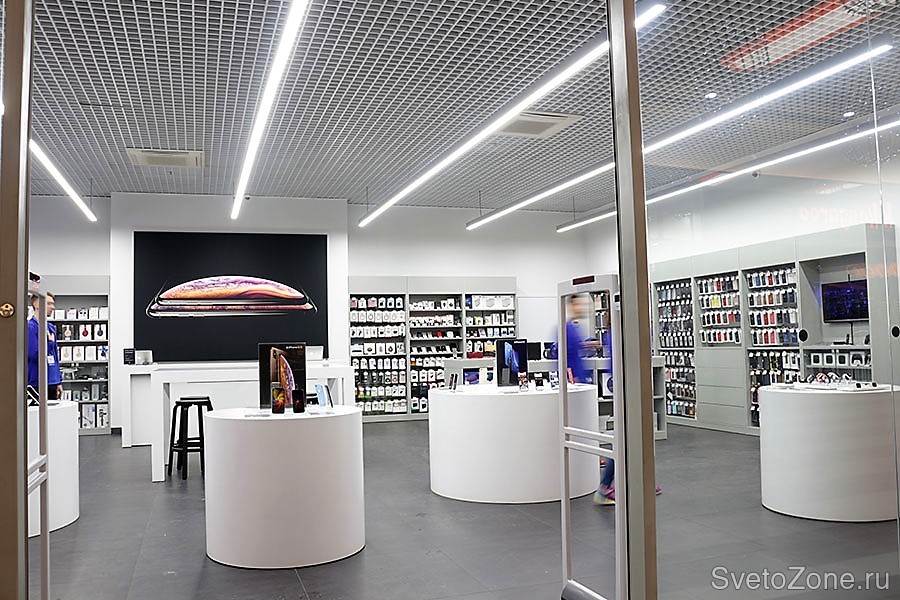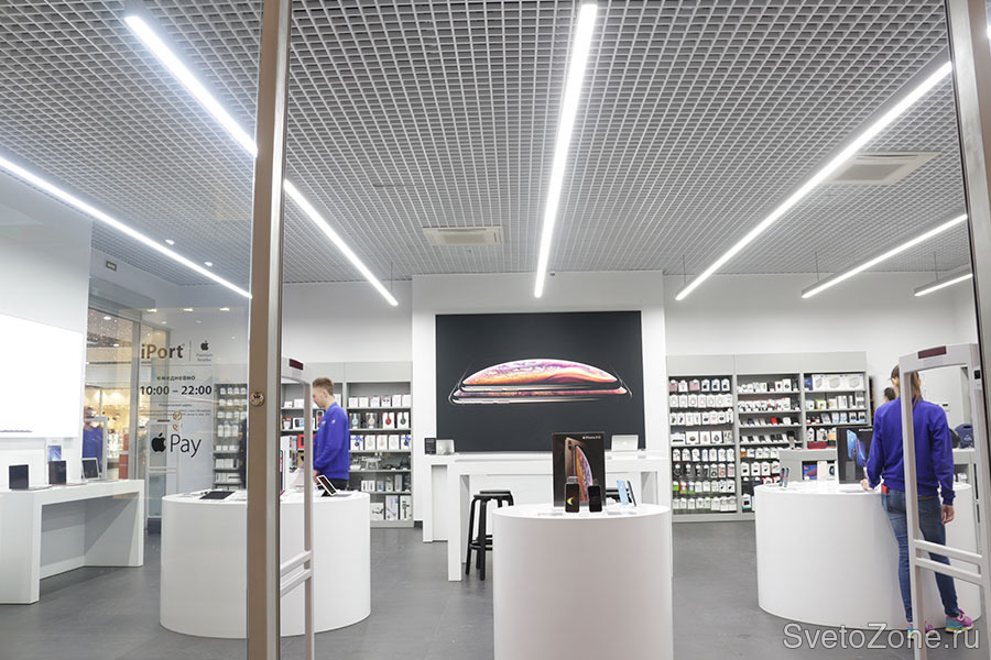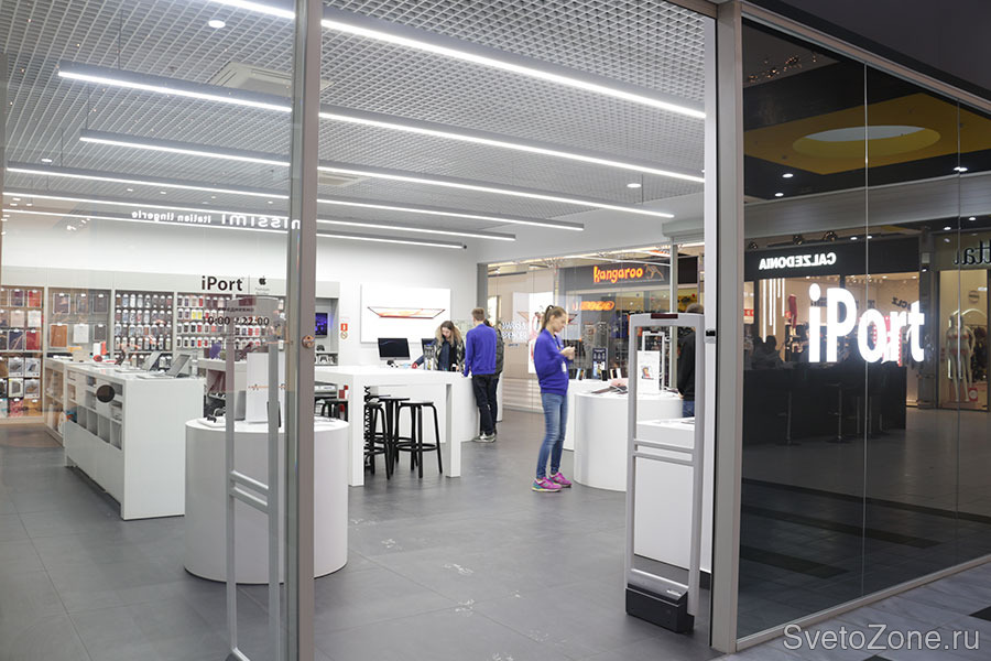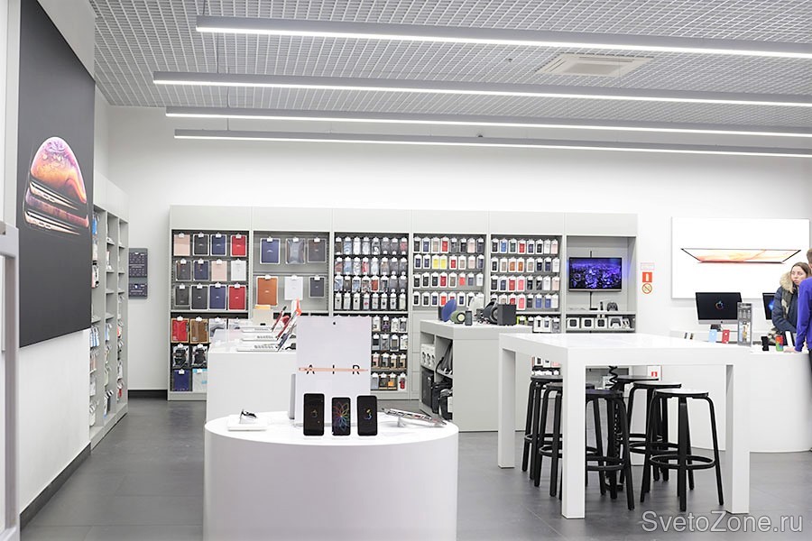 Для сети магазинов IPort потребовались современные светодиодные светильники подчеркивающие стильный дизайн интерьера и инновационных продуктов, представленных на витринах, средняя освещенность должна быть около 1000лк.