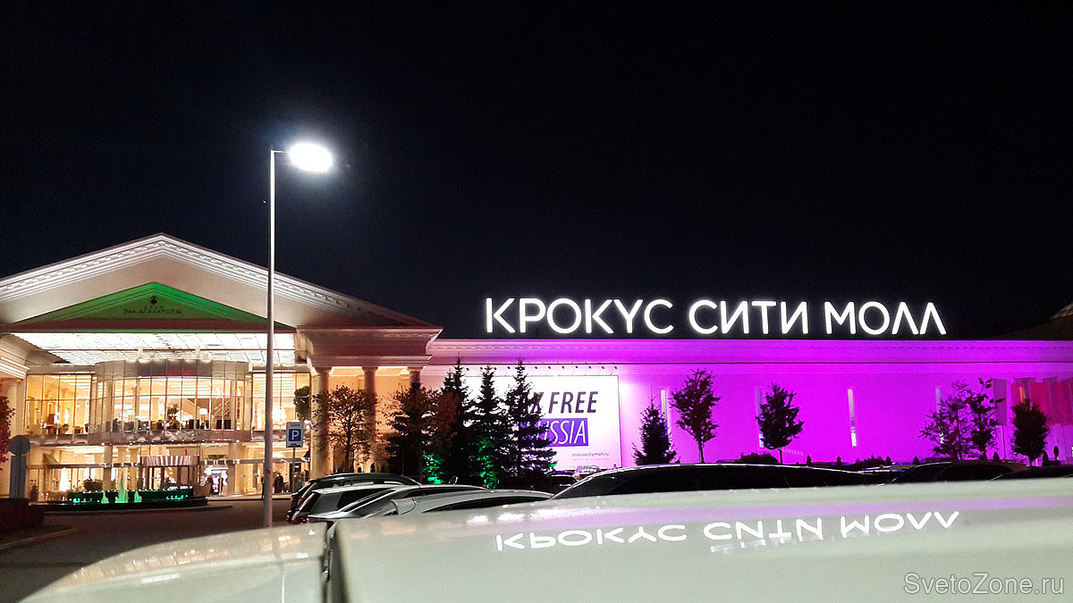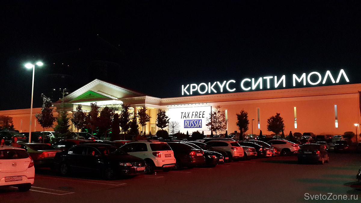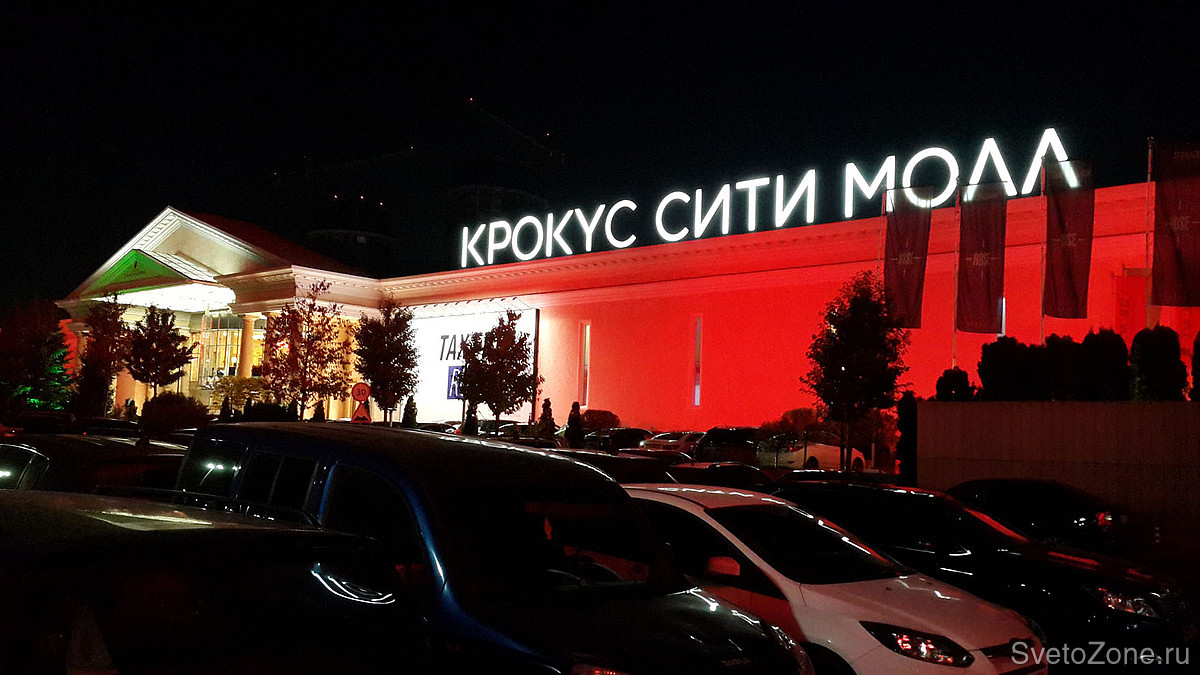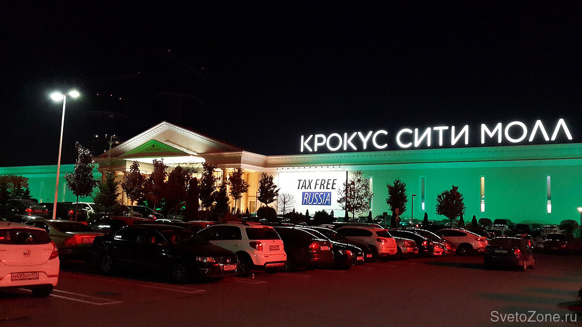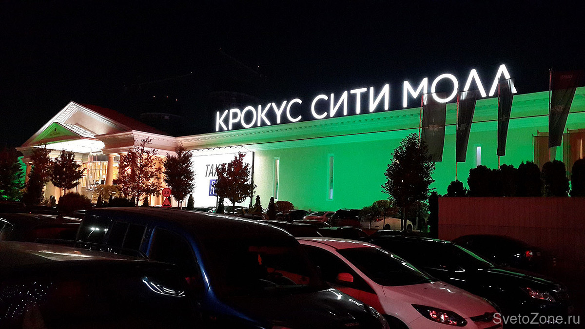Общая протяженность главного фасада ТЦ Крокус Сити Молл составляет около 250 метров. Высота освещаемых поверхностей достигает в высоту 12 метров.