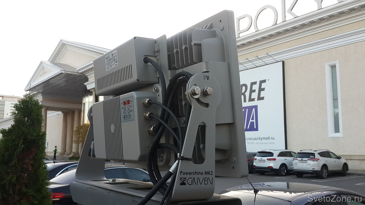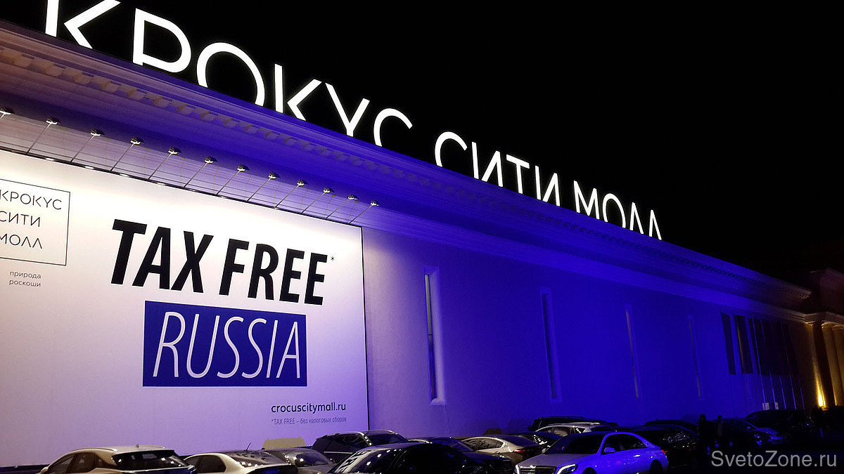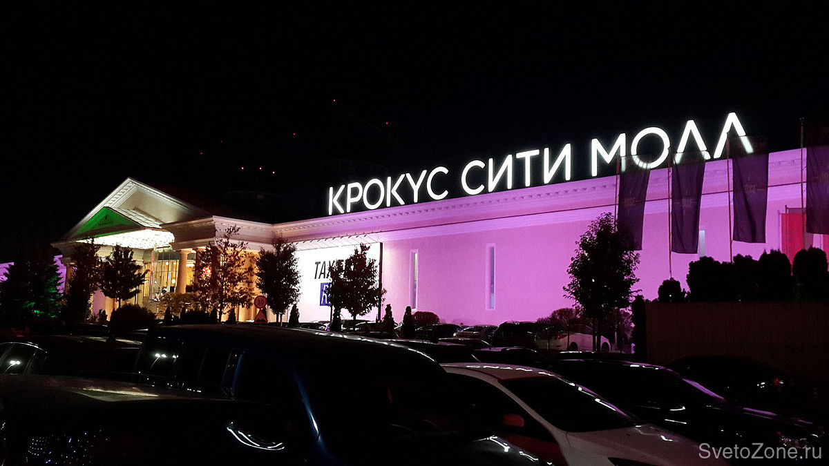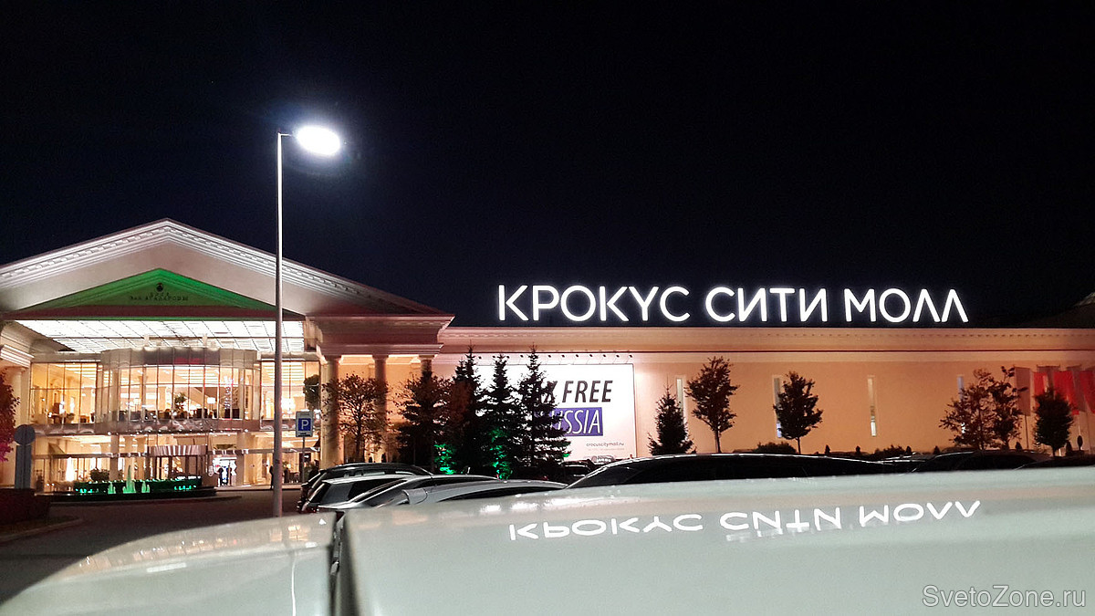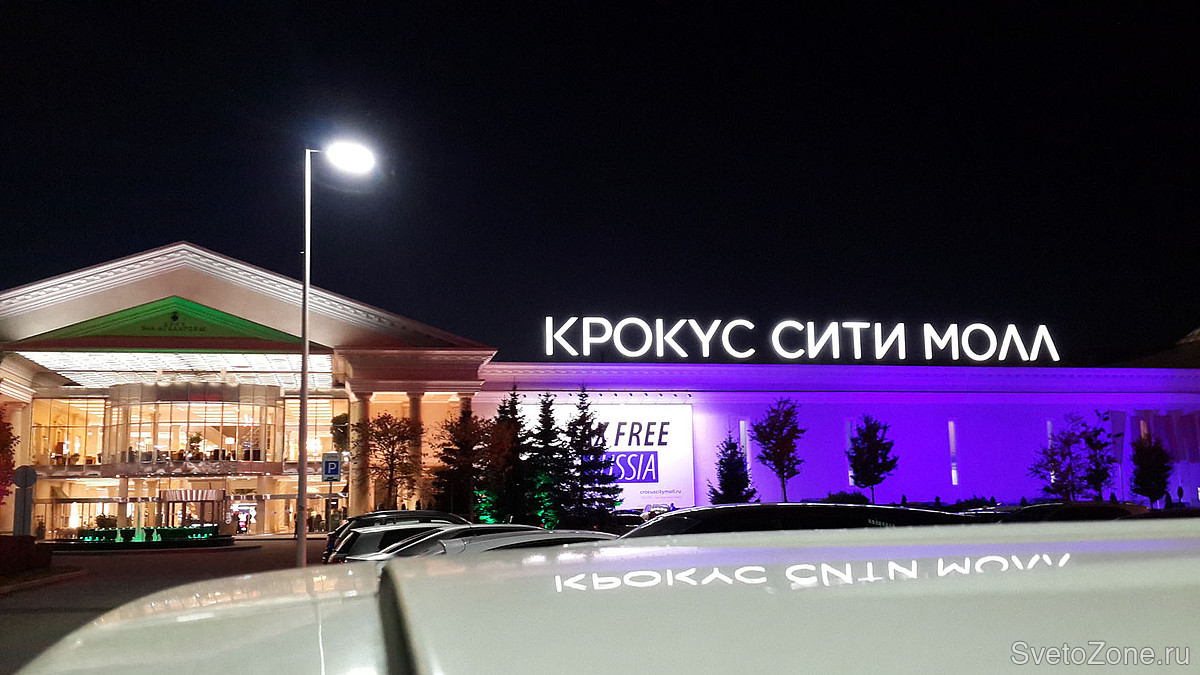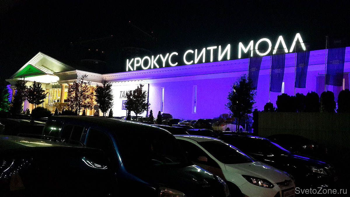 Общая протяженность главного фасада ТЦ Крокус Сити Молл составляет около 250 метров. Высота освещаемых поверхностей достигает в высоту 12 метров.