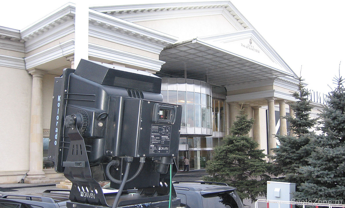 До настоящего времени общее заливающее освещение фасадов комплекса было выполнено при помощи мощных колоченджеров GRIVEN KOLORADO 4000. Шесть МГЛ прожекторов мощностью 4000 Вт каждый были установлены вдоль линии фасада на расстоянии около 23 метров от освещаемых поверхностей.