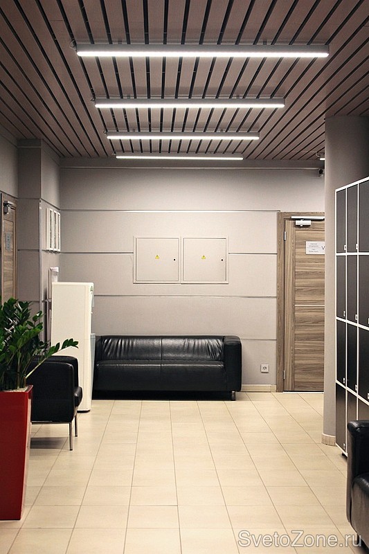 Для тренажерного зала были выбраны TRL Market Mini LED40, для коридоров – TRL Lotos AL 30. Всего установлено 89 светильников. Для TRL Market Mini использован подвесной монтаж с объединением нескольких моделей в единые линии, для TRL Lotos Al – накладной монтаж на реечный потолок. |
