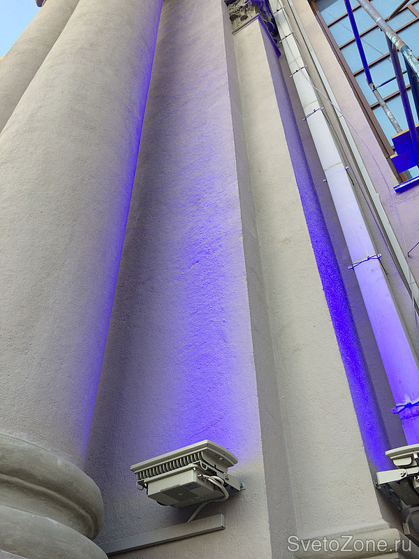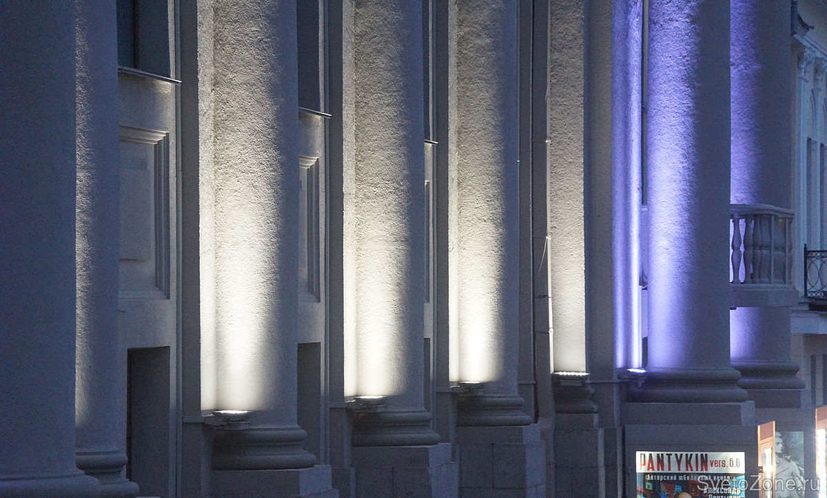 Освещение колонн выполнено при помощи прожекторов GRIVEN CORAL с узкой и средней оптикой. Приборы установлены попарно у основания колонн и нацелены снизу вверх. Мощность светового выхода позволяет равномерно "протянуть" освещаемые поверхности, не зацепив при этом примыкающие окна.