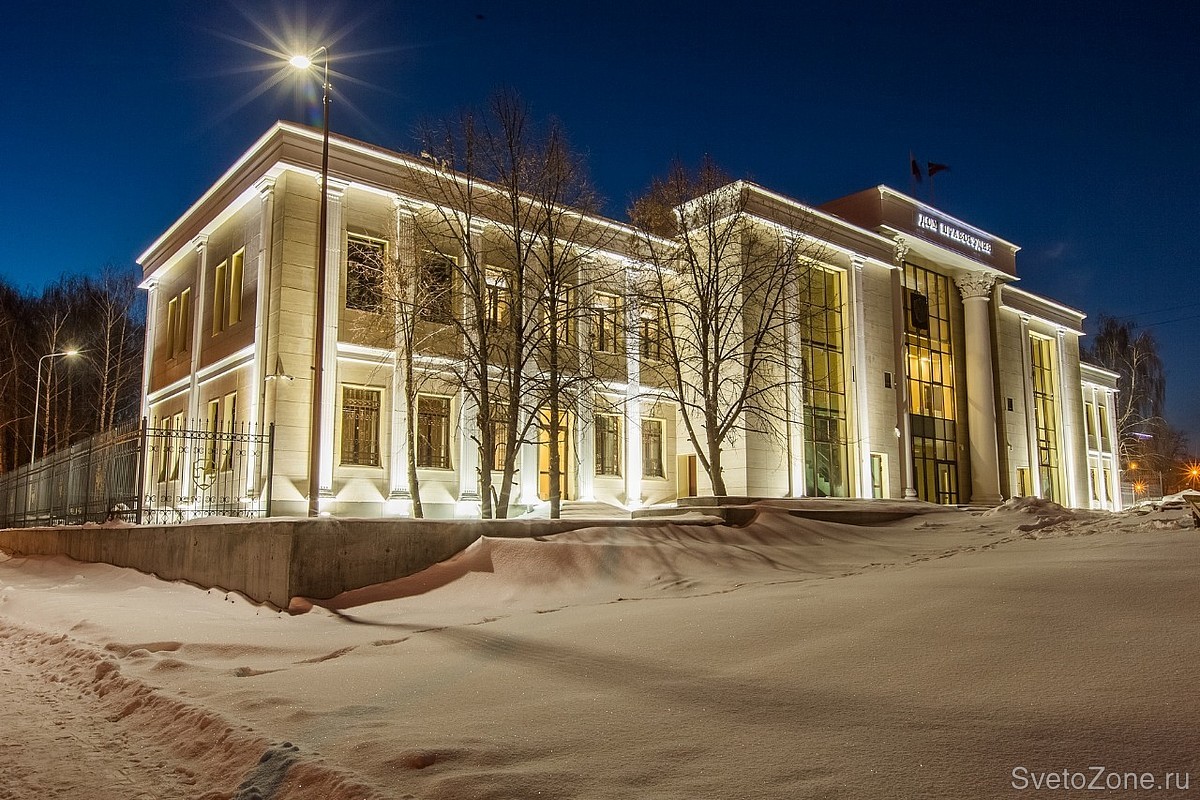 Для подсветки фасада были применены светодиодные светильники серии ДСП разной цветовой температуры: центральные колонны освещены теплым светом, колонны на заднем плане – холодным белым. Флаги на крыше здания подсвечены светодиодными светильниками FWL 14-52-W50-F15.