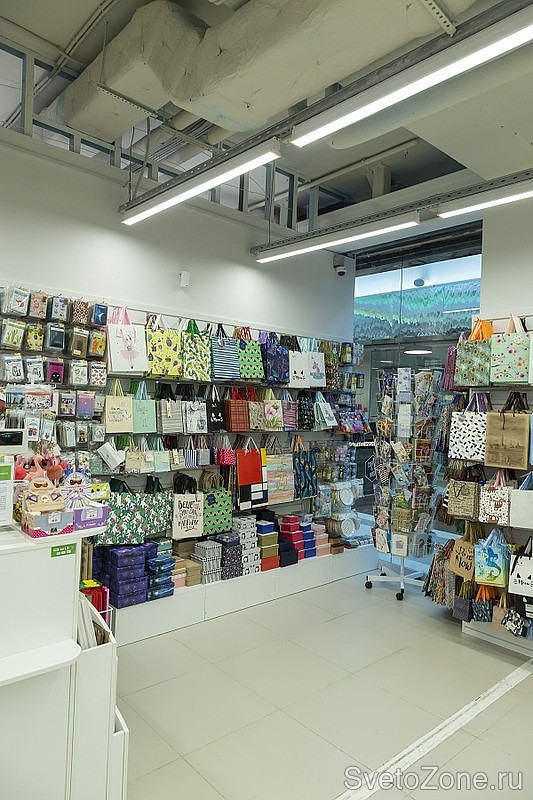 равномерно освещают пространство, хорошо видно всю продукцию, что позволяет легко ориентироваться в магазине в поисках нужного товара; хорошая цветовая передача, что особенно важно для канцелярских товаров, сувенирной продукции; цветовая температура напоминает свет в яркий солнечный день. При таком освещении приятно находиться в магазине, можно читать книгу без риска испортить зрение. |