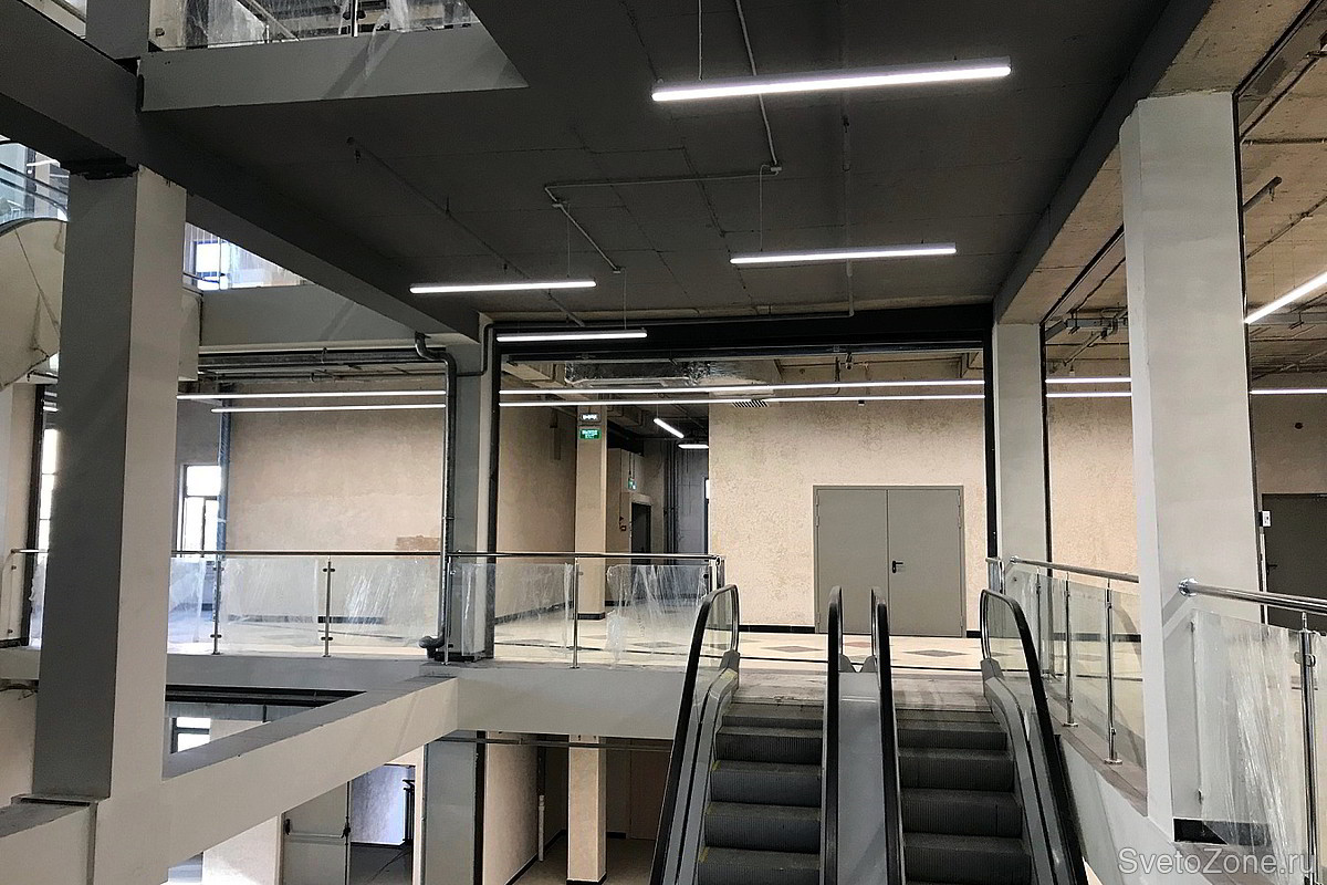Основной холл второго этажа освещают TRL Market LED65, закрепленные на металлические балки потолочной конструкции. Для освещения основных путей передвижения по комплексу установлены светильники TRL Lotos AL 30, объединенные в единые линии. Эта же модель светильников использована для освещения зоны эскалаторов.