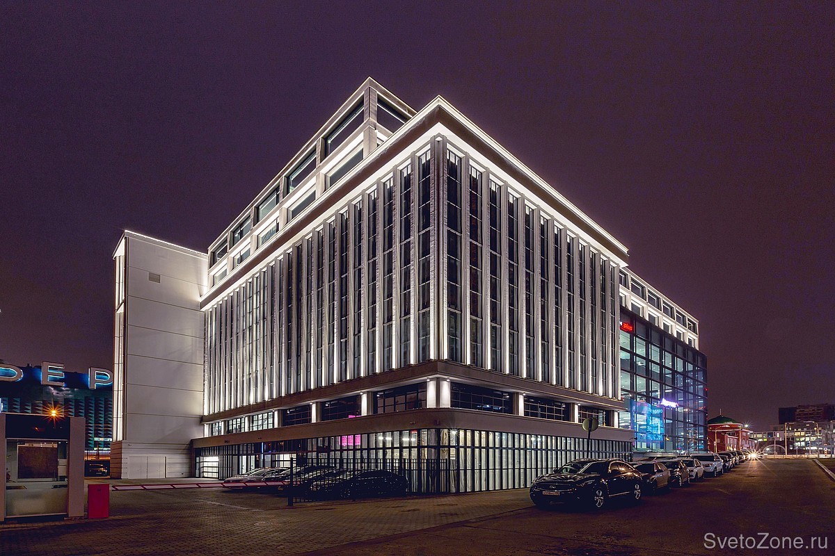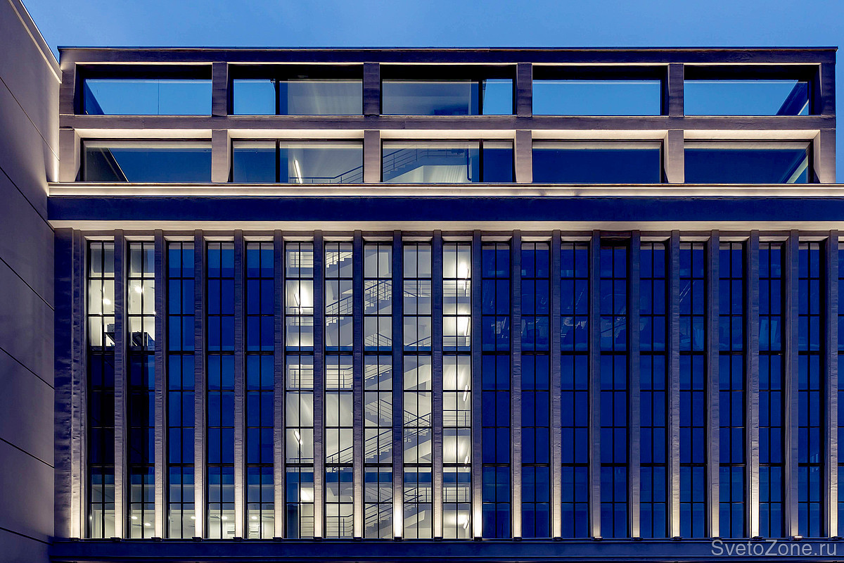 Днем простая геометрия здания позволяет сосредоточить внимание на основном выразительном мотиве фасада — ритмичном чередовании полуколонн. Ночью конструктивистское фасадное решение акцентировано прожекторами серии IntiSTARK, которые закреплены у основания полуколонн. Корпуса светильников выкрашены в цвет фасада. IntiSTARK также выделяют шестиэтажный пилон, который вынесен из общего объема. Ниши в пилястрах первого этажа освещены компактными светильниками серии IntiROLL c узкой оптикой 30°.