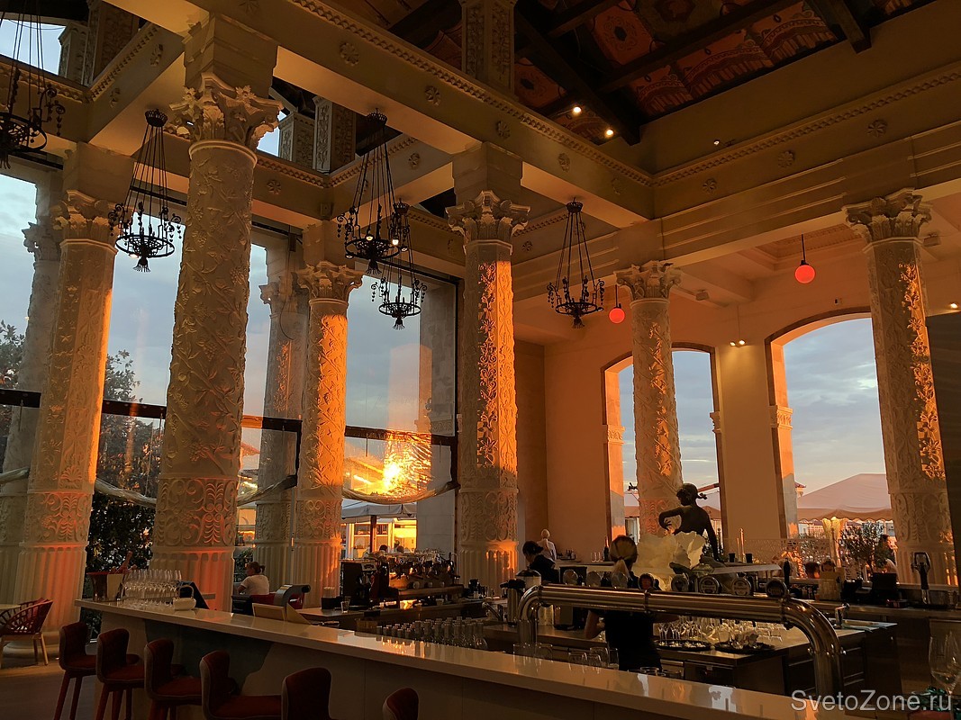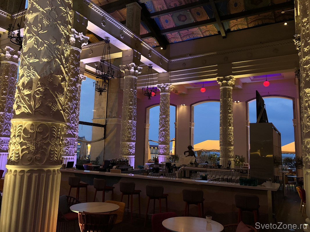 Близкое расположение к причалу вдохновило светодизайнеров на создание особой световой обстановки — запечатлеть и распространить на пространство ресторана природные явления — солнечные лучи, блики на воде на закате, танец теней деревьев.