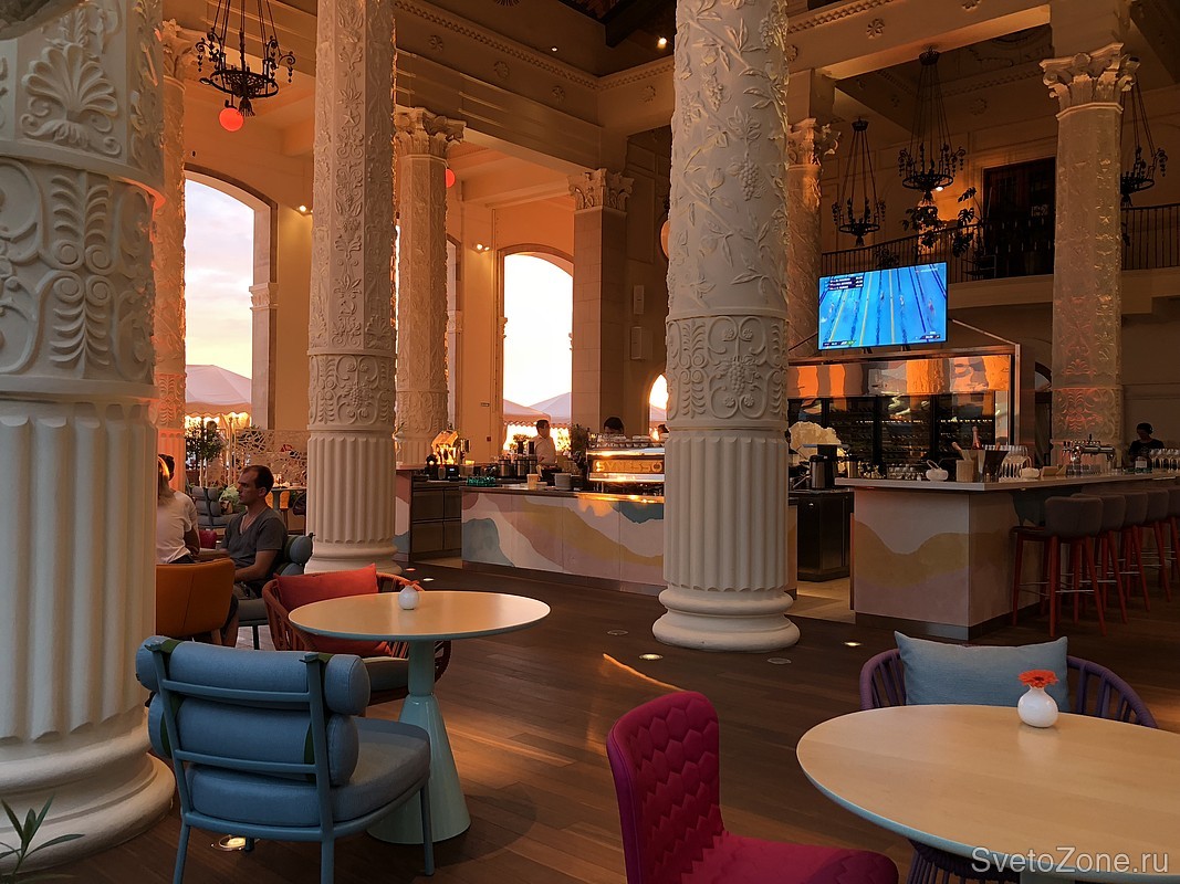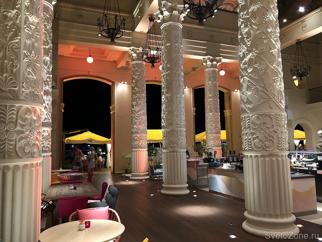 Для создания сложных цветов и динамических цветовых сценариев, дополняющих естественное освещение ресторана, использованы компактные акцентные прожекторы серии IntiTOP c углом свечения 40x20° и 24-градусные IntiSPOT. Светильники обладают высокой степенью защиты от внешних воздействий и температурным диапазоном от -40°С до +45°С, что идеально подходит для субтропического климата Сочи.
