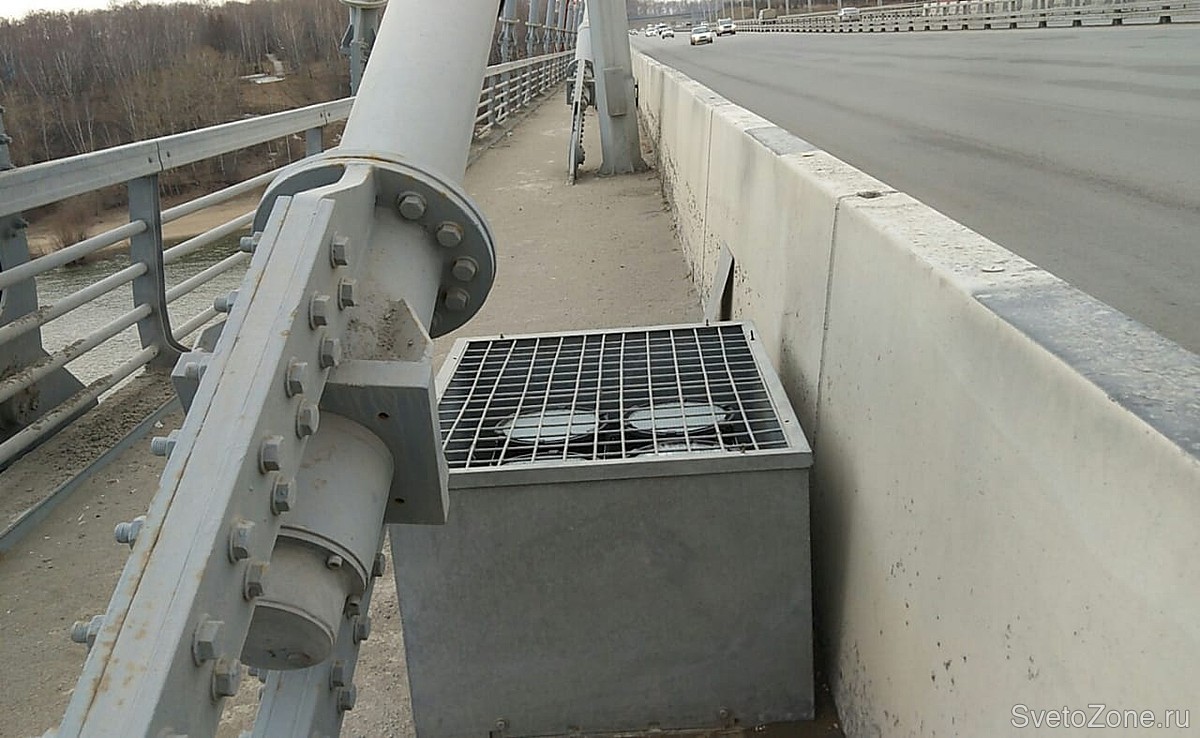Для дополнительной безопасности прожектора установили в специальные металлические короба с решетками, вдоль пешеходного прохода арки. |